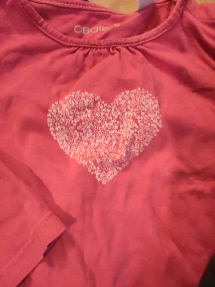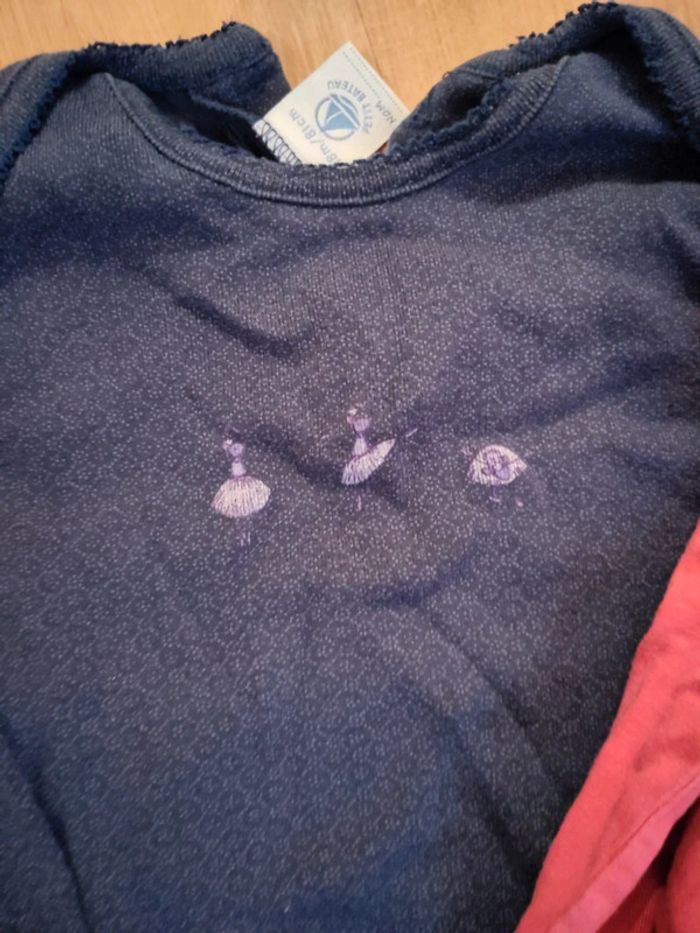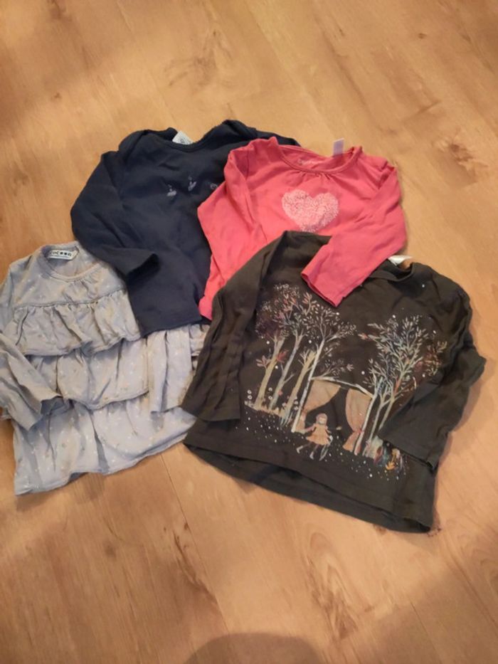 4 t-shirts manches longues : rose à coeur Obaibi, marron foncé Zara, à fleur Vertbaudet et bleu foncé Petit bateau (18 mois mais taille petit).