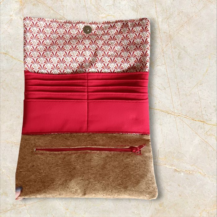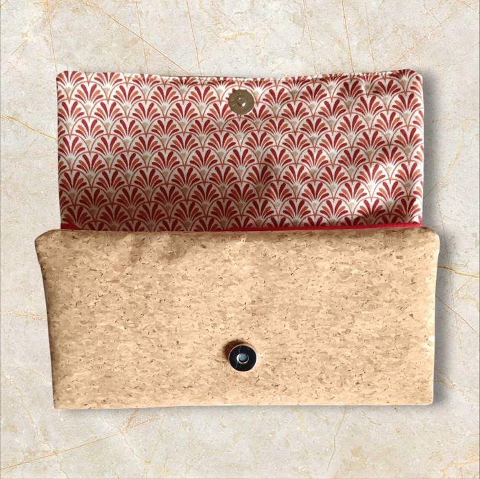 Tissus liège et tissus oeko TeX. Facile d'utilisation avec ses grands rangements. Création originale, fait à la main.