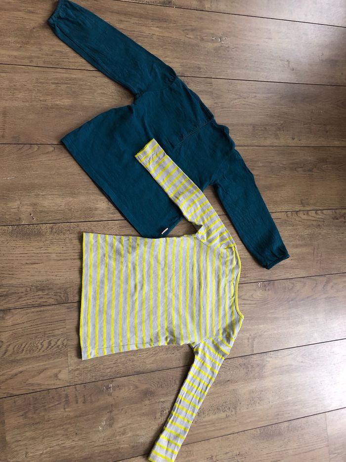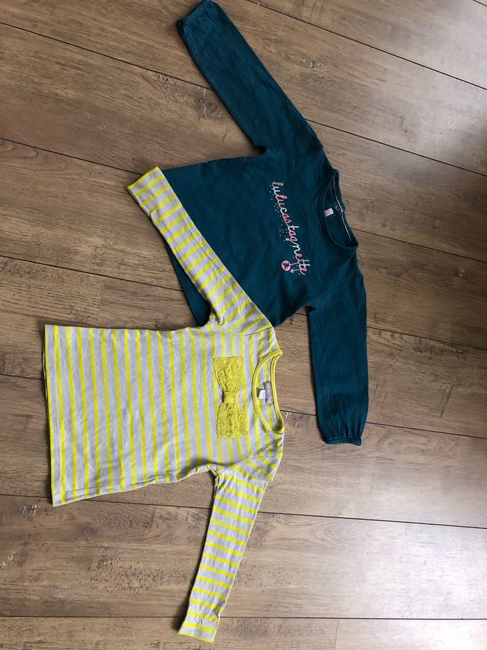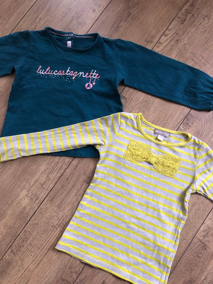 Lot de 2 t shirts: - le vert lulu castagnette 24 mois a un petit trou (voir photo) - le jaune et gris 3 ans (taille petit) a quelques bouloches