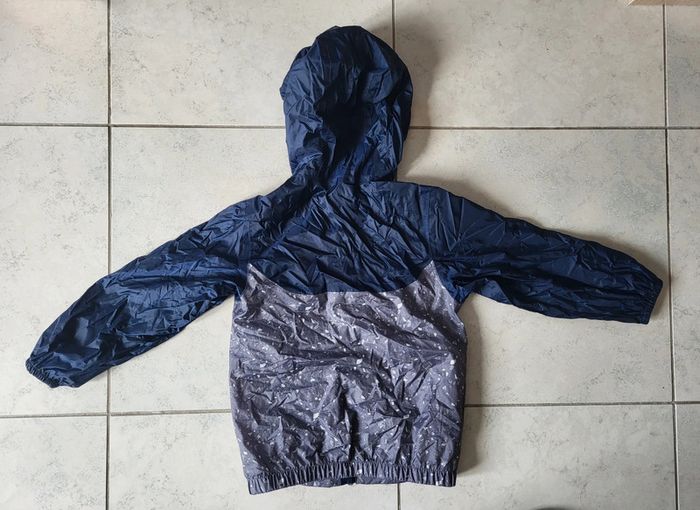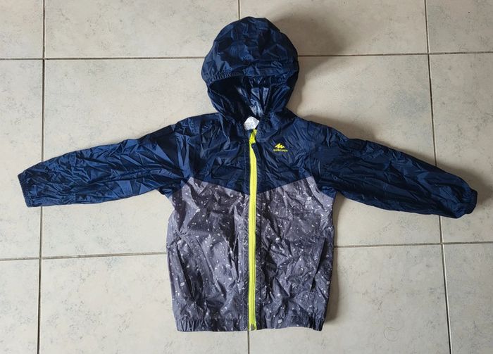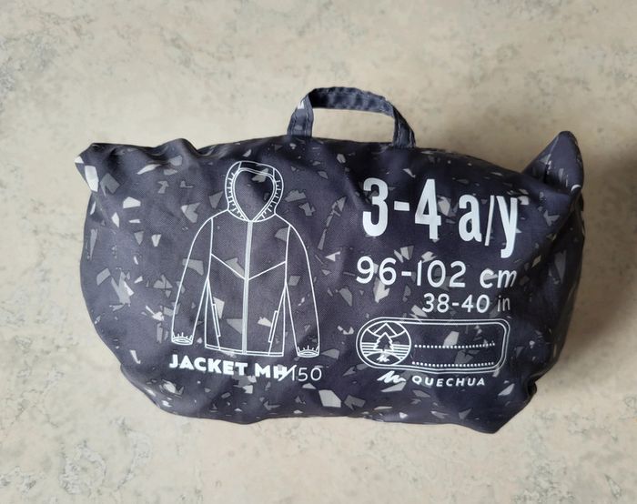 Veste de pluie Queshua qui se replie dans sa poche. État neuf, porté qq fois en dépannage. Taille 3-4 ans.