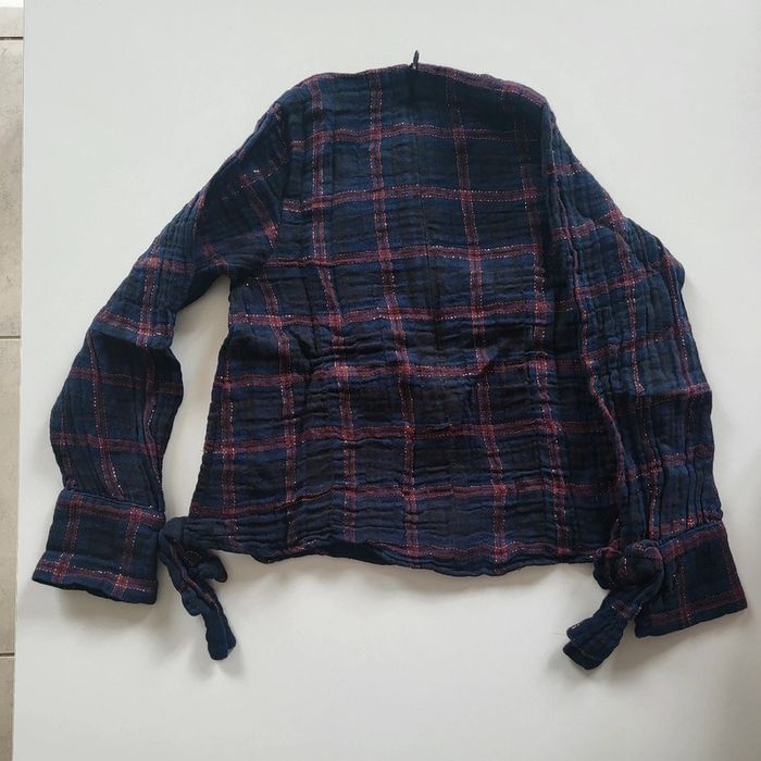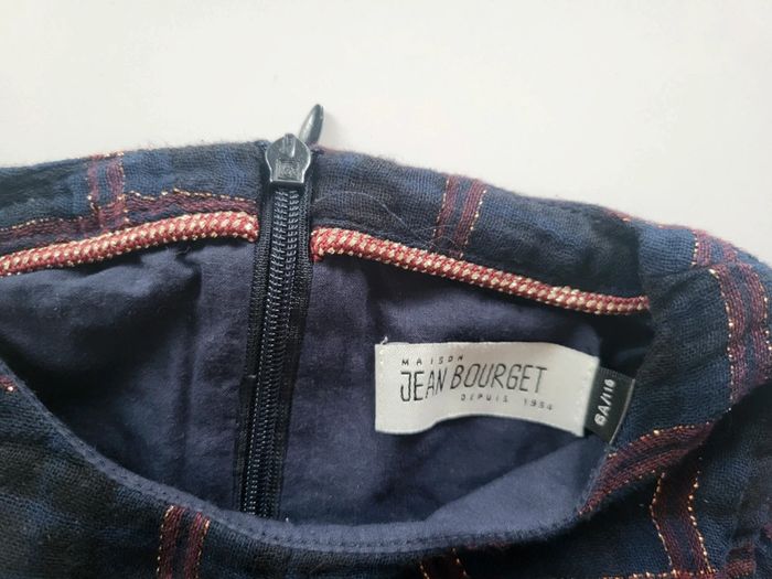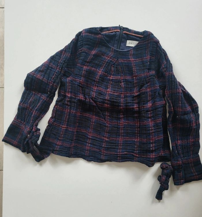 Chemise / blouse à manches longues Jean Bourget. Bleu marine et bordeau surpiqures dorés à carreaux. Excellent état. Taille 6 ans
