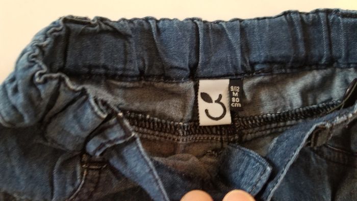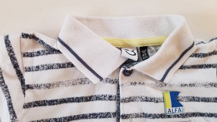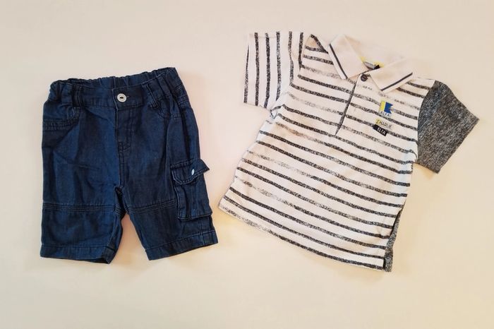 Ensemble 3 pommes composé d'un polo rayé bleu et blanc et d'un short couleur Jean brut. Excellent état. Taille 9-12 mois
