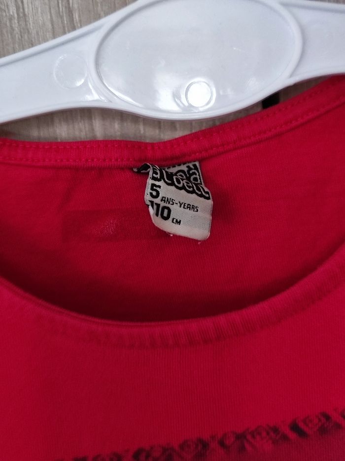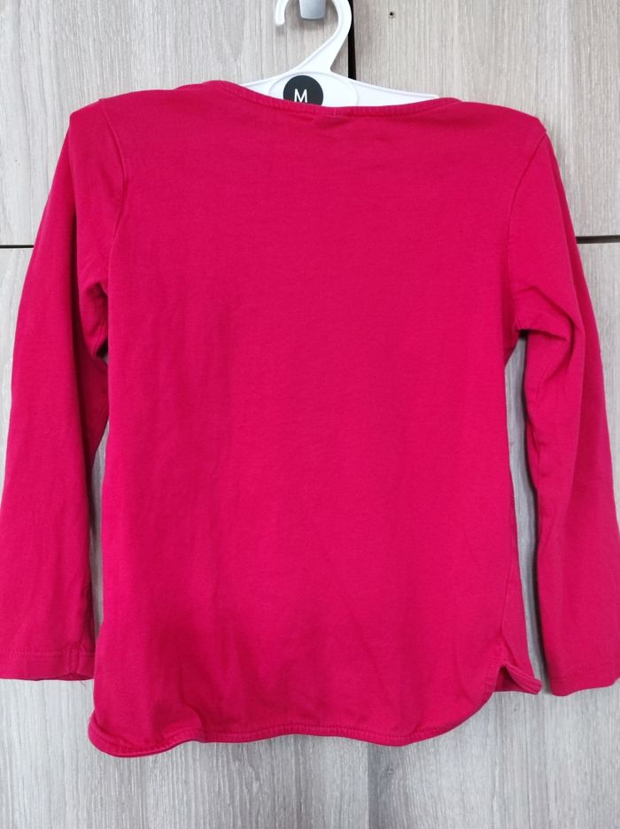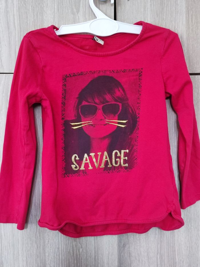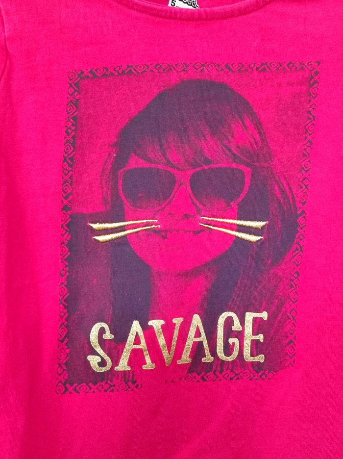 T shirt / top / sweat fin Marque Tape a l'oeil Taille 5 ans / 110 cm Col rond. Manches longues . Coloris rose fuschia avec portrait de fille imprimé en noir avec moustache brodé fil doré et écriture 'savage' pailleté / sauvage. Coupe relevé sur chaque côté. Parfait état. 100 % coton.