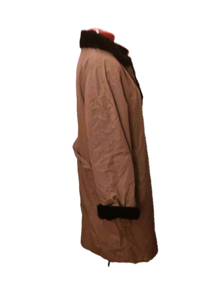 <<<<Regardez bien les mensurations, pas de taille visible.Merci>>> Trench beige avec Fausse fourrure noire. Longueur totale : 120 cm. D'une aisselle à l'autre : 63 cm. 2 poches à l'italienne. Ceinture. #Doudoune