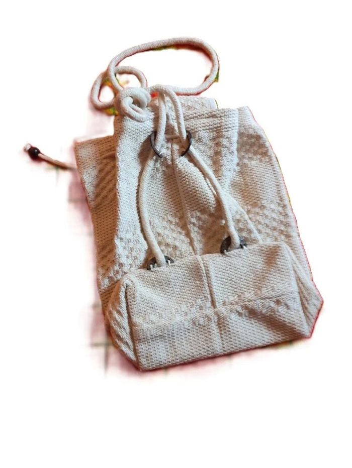 👩🏻#verseau59_tailleSac Sac à dos bohème . Crème. Cordon de serrage. Bouton fermeture. Longueur totale :34 cm. Largeur 15 cm et plus.. Fond du sac : rectangle de 24 cm X 14 cm.