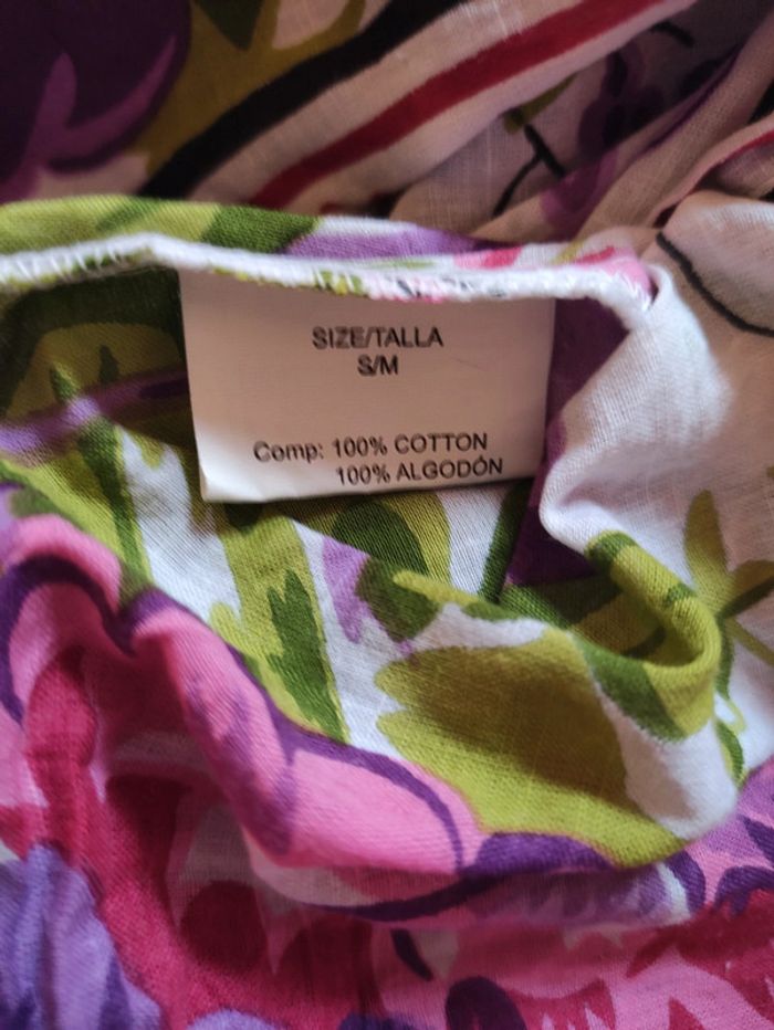 Tunique blanche fleurie multicouleurs Pushkar. Taille S M. Longueur totale : 92 cm. D'une aisselle à l'autre : 52 cm. Longueur manche : 41 cm. Ouverture par côté en bas sur 26 cm. Coton.