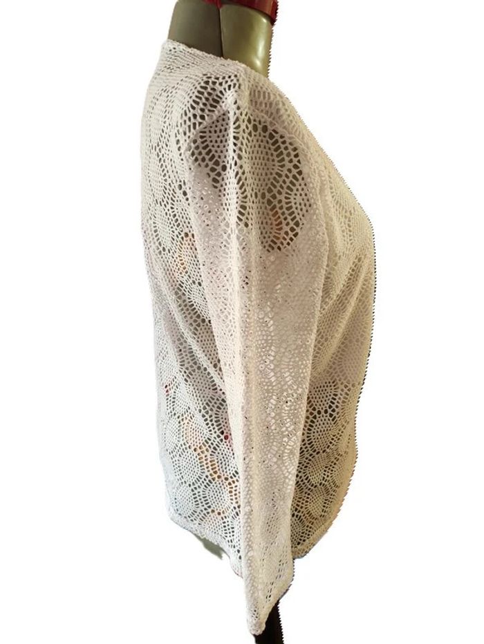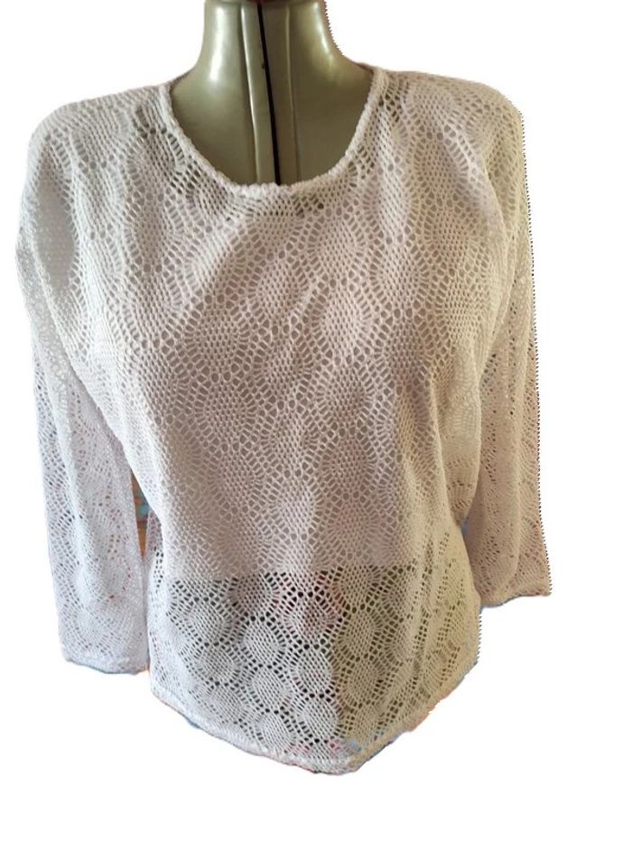 👩🏻#verseau59_taille42Tunique Tunique blanche. Ajourée. Taille :42.(voir mensurations). Longueur totale : 64 cm. D'Une aisselle à l'autre : 55 cm. Longueur manche : 56 cm. Tissu doublé intérieur sur le devant.