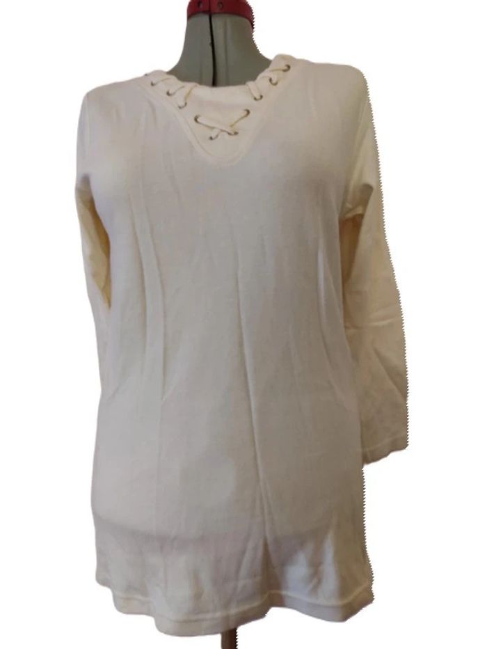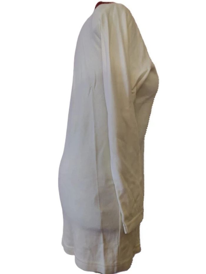 Robe molletonnée crème .Taille 38/40. Longueur totale : 73 cm. D'une aisselle à l'autre : 54 cm. Longueur manche : 59 cm. Coton. Lavage 40°.