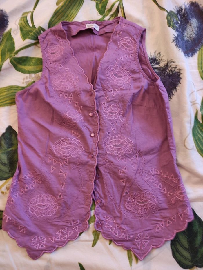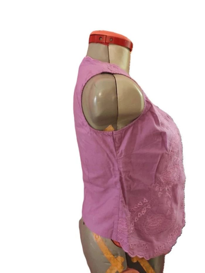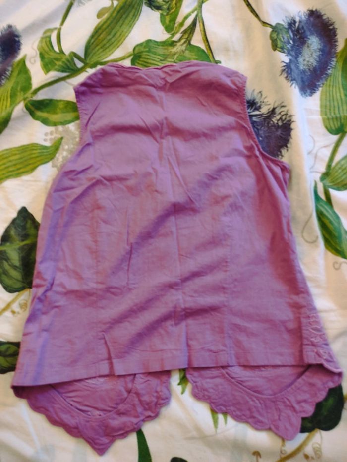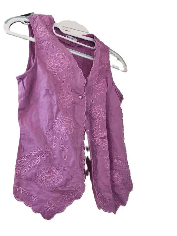 👩🏻#verseau59_taille38Chemise Top violet broderies blanche porte Taille 38 Chemisier top violet blanche porte Taille 38 Longueur totale : 55 cm D'Une aisselle à l'autre : 44 cm Coton 100%. lavage 30°.