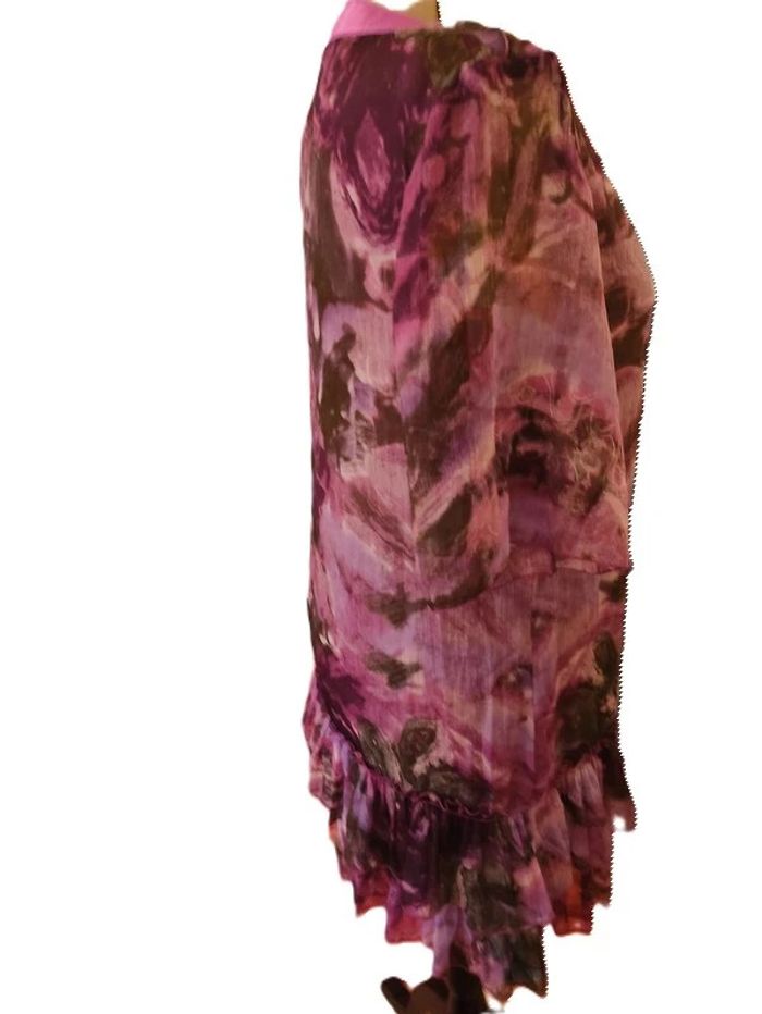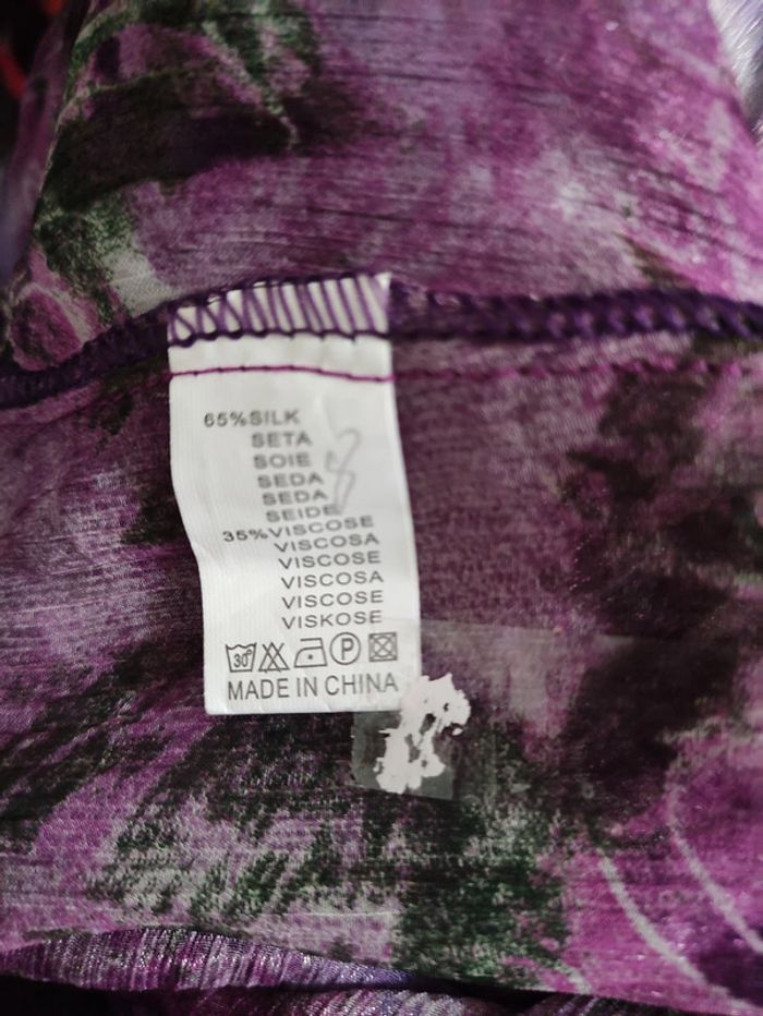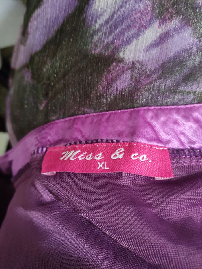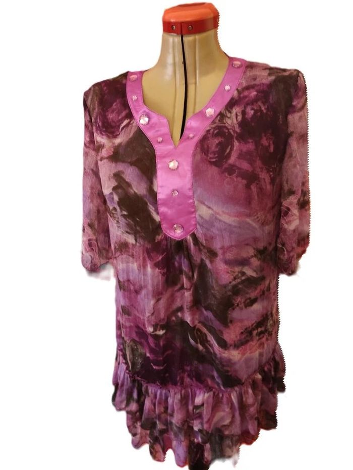 Robe légère douce Violette imprimée avec brillants Miss & Co.Taille XL. Longueur totale : 86 cm. D'Une aisselle à l'autre : 56 cm. Doublée jupon violet. Soie 65 % . Viscose 35%. Lavage 30°.