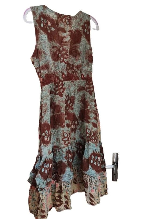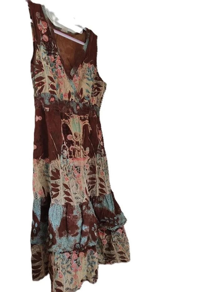 👩🏻#verseau59_taille38Robe Robe légère marron imprimé .décoration fantaisies. Taille :38? Longueur totale :106 cm. D'une aisselle à l'autre :49 cm. Doublée jupon marron. Ceinture smockée. Coton. Lavage 30°.