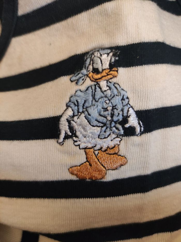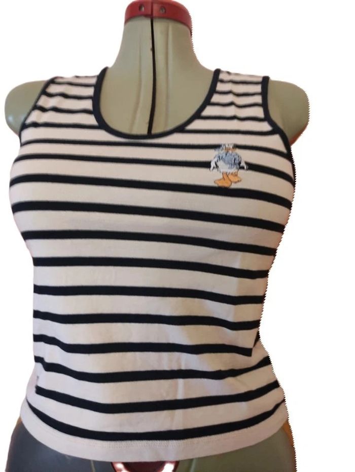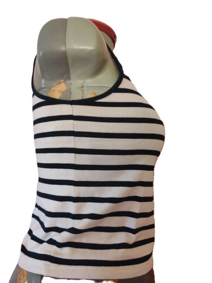 👩🏻#verseau59_taille36Top Débardeur marine blanc rayé. Taille 36. Avec un dessin en haut à gauche. Longueur totale : 51 cm. D'une aisselle à l'autre : 43 cm. Lavage 30°. Coton.