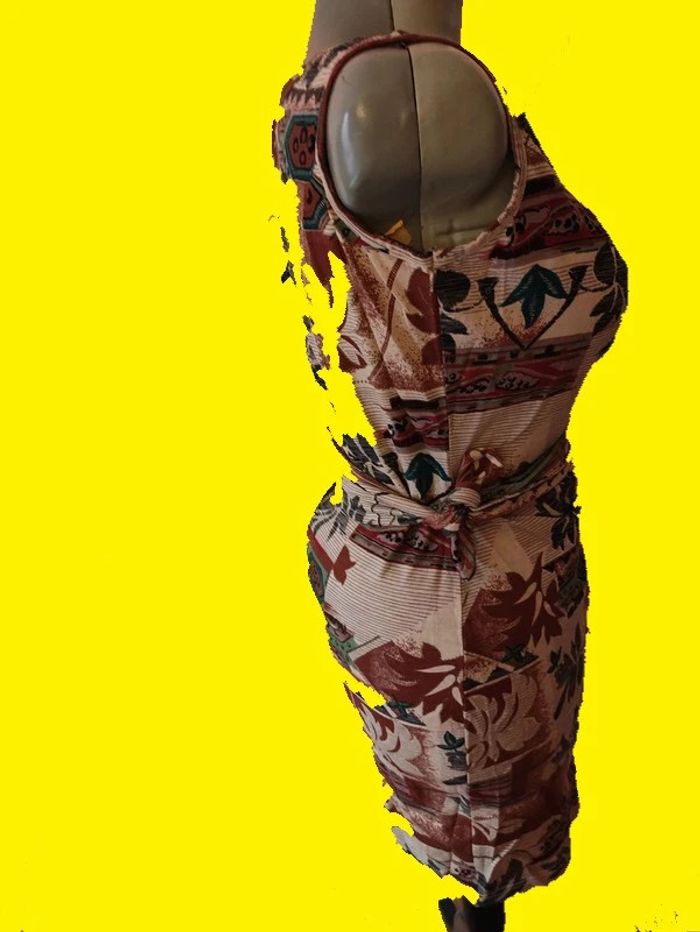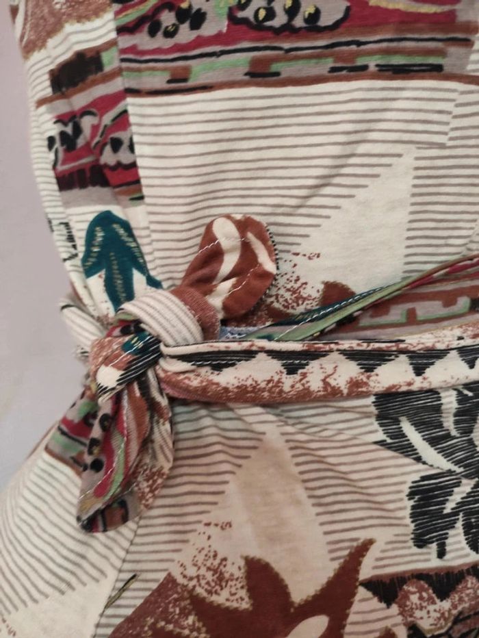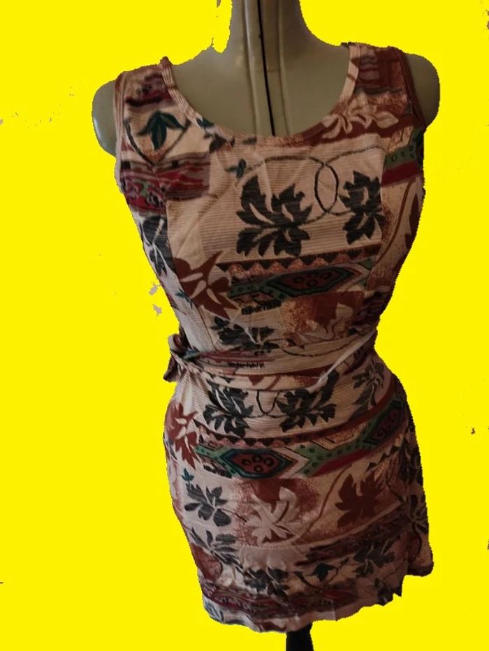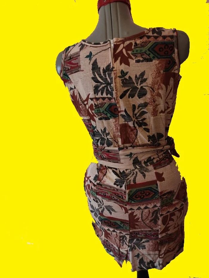 <<<<Aucune étiquette, Tissu élasthanne>>> Taille 40???? Robe Bohème atypique marron divers couleurs. Robe avec sérigraphie. Longueur totale : 85 cm. D'une aisselle à l'autre : 55 cm. Fermeture éclair dos. Rabat pan de jupe à nouer, avec large ceinture.