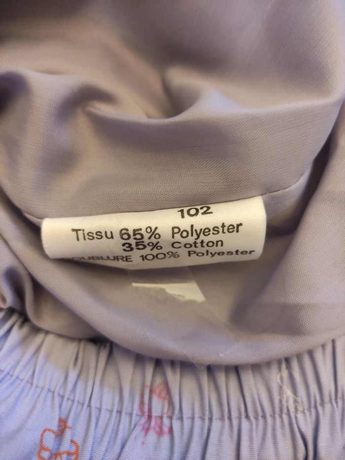 Très bon état. Anorak 3 suisses 4 ans. Violet aves des dessins. Zippé 2 poches. Tissu polyester coton. Doublure : Polyester. Lavage 30°.