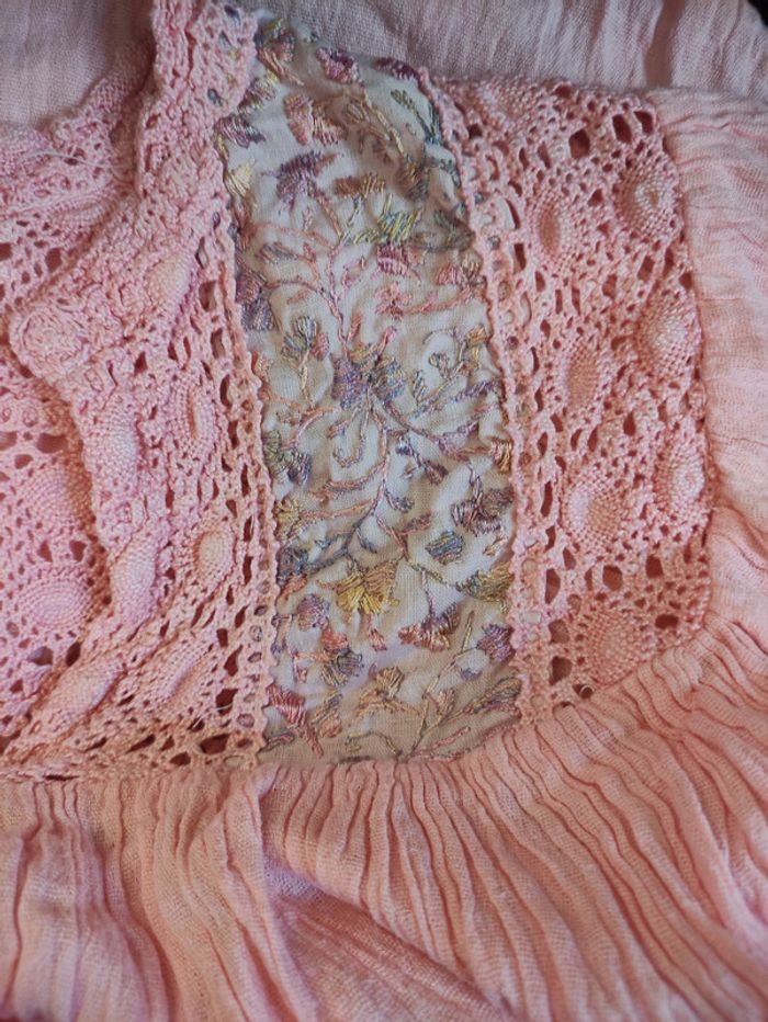 Tunique Bohème Blouse bouffante ample rose manche 3/4 élastiquée fond. 👩🏻{hashtag1} Tunique Bohème bouffante rose manche 3/4. Taille 44. Sérigraphie dentelle autour du cou. Longueur totale :72 cm. D'Une aisselle à l'autre :68 cm et plus... Longueur manche :42 cm d'une épaule à l'autre : 37cm. <<<<Regardez bien les mensuration, car aucune étiquette. Merci.>>>>>>>>>