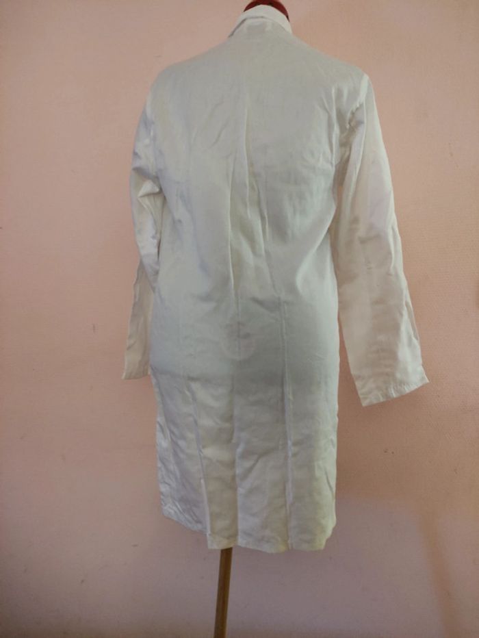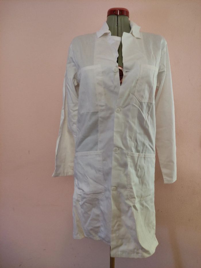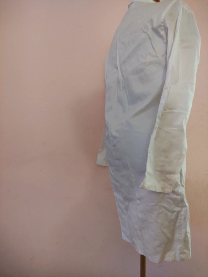 Blouse Blanche. Taille 40. Longueur totale : 90 cm. D'Une aisselle à l'autre : 51 cm. Longueur manche : 61 cm. 3 poches sur le devant, 1 poche en hauteur à l'intérieur à droite. Coton. Lavage 90°.