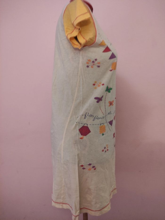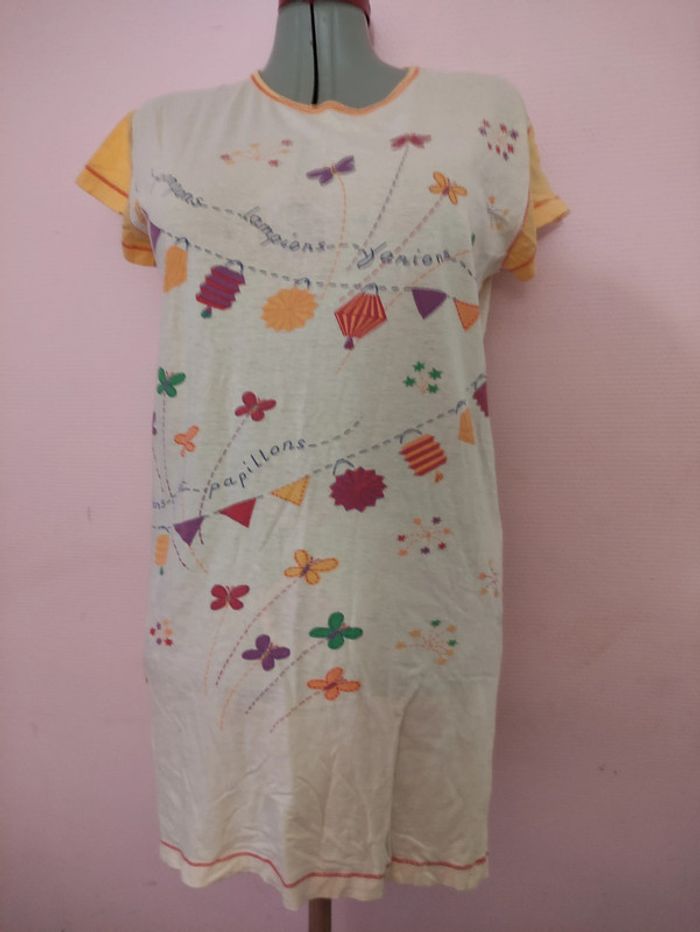 <<<<Regardez bien les mensurations, aucune étiquette,...Merci... Nuisette colorée imprimée jaune multicouleurs . Taille : Longueur totale : 85 cm. D'une aisselle à l'autre : 56 cm.