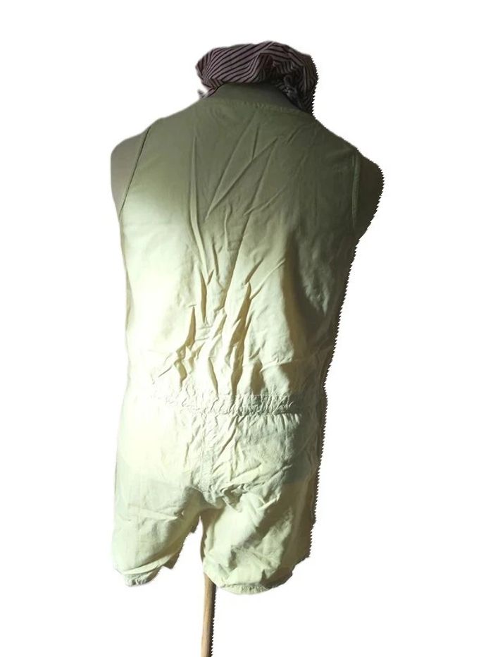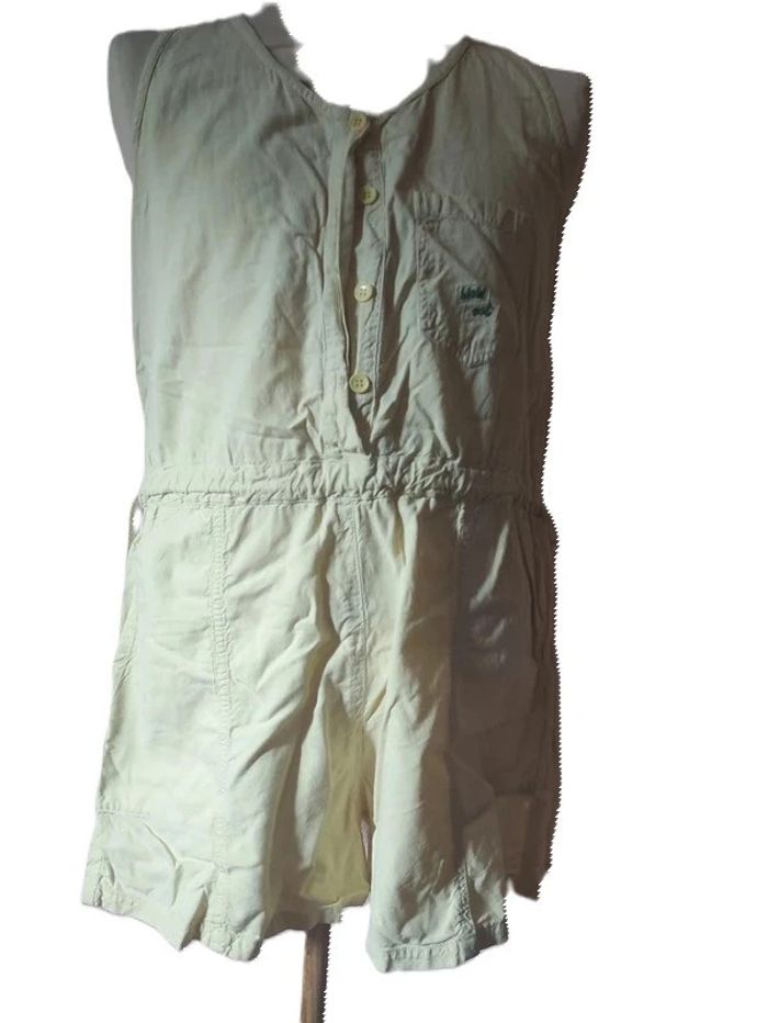 Combinaison short jaune Taille 3 44/46. Combinaison Jaune . Taille 3. Longueur totale : 81 cm. D'Une aisselle à l'autre :52 cm. Tour de Taille :94 cm. Fermeture boutons le haut de la combinaison. Lien par côté à nouer, pour le tour de Taille. 2 poches profondes sur le devant.