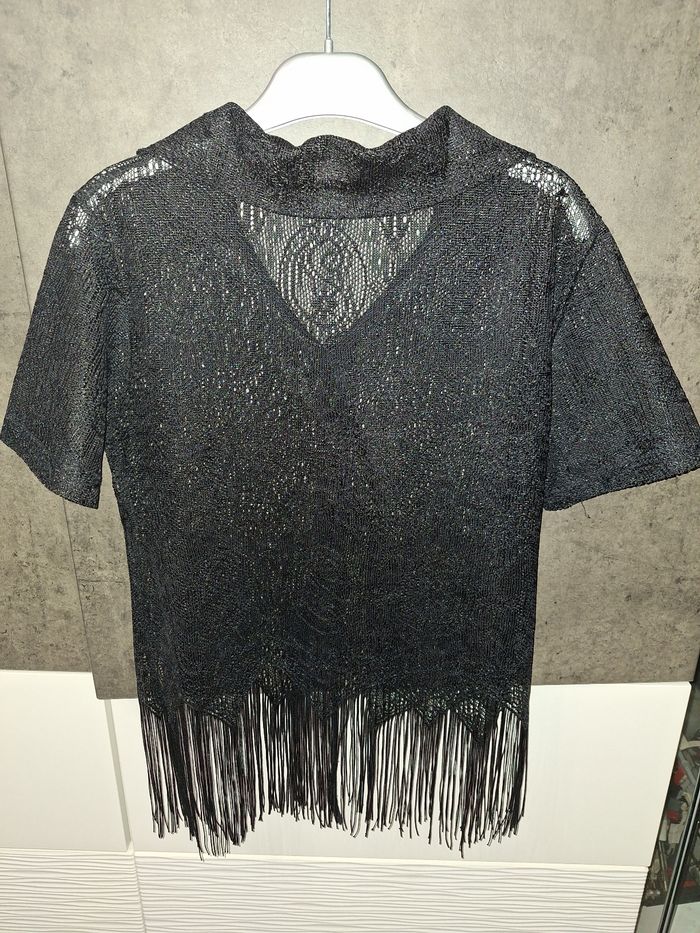 Jolie blouse manches courtes en dentelle noire et franges, fermée par pressions et liens à nouer, taille 38/40, peu portée en très bon état