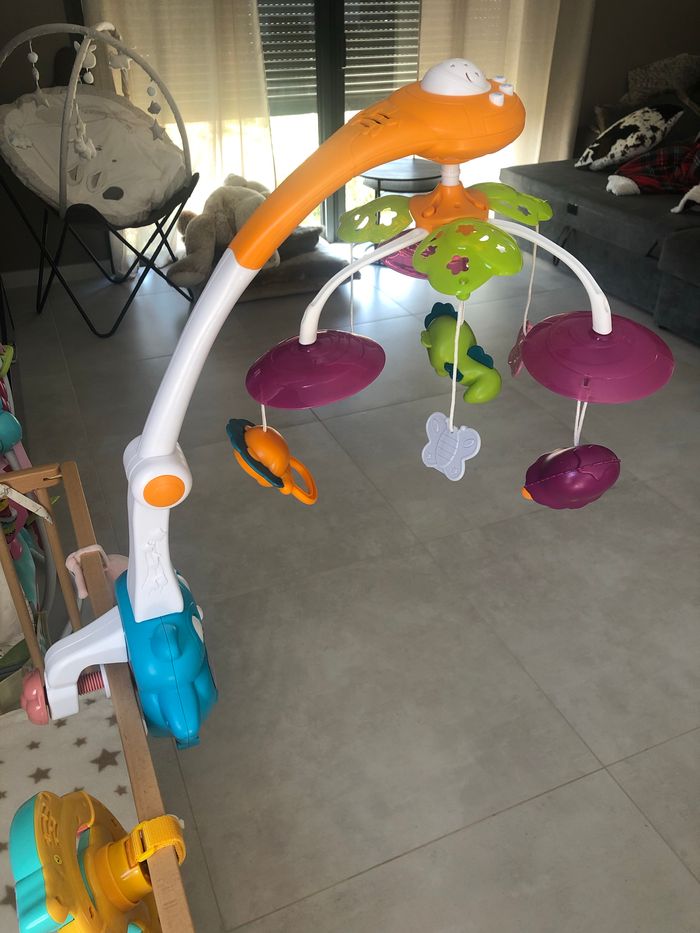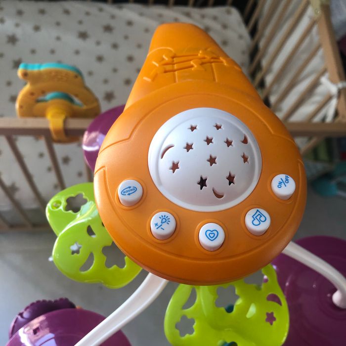Je vends ce mobile musical , peut se mettre sur un lit , sur un parc , car réglable pour l’attache. Il tourne , joue plusieurs musiques et fait de la lumière (projection d’étoiles au plafond et le hibou aussi s’allume) . Fonctionne avec des piles. Servi 3 fois.