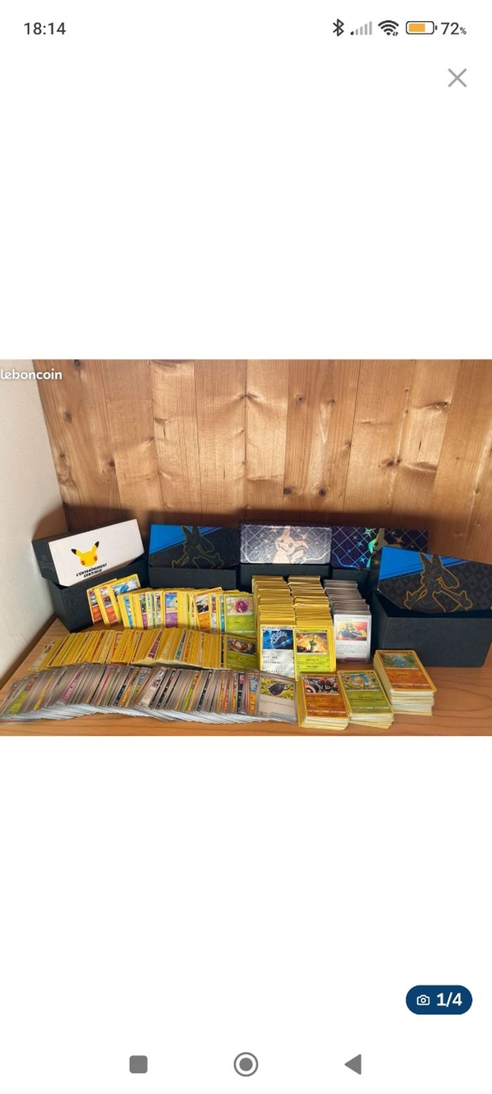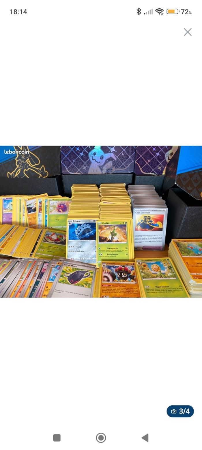 Bonjour, Collectionneur de longue date, je vends des lots de cartes Pokémon. Les cartes sont neuves, françaises et authentiques. Les lots sont vendus SANS DOUBLE ni carte énergie. Mes offres sont les suivantes : ....................... ⭐️ 100 cartes normal pour 6€+1 brillante offerte............................................................⭐️ 200 cartes normal pour 12 €+2 brillante offerte .................................................... ....... ⭐️ 300 cartes normal pour 18€+ 3 brillante offerte ........................................................... ⭐️ 400 cartes normal pour 24 €+4 brillante offerte ........................................................... ⭐️ 500 cartes normal pour 30€+5 brillante offerte ........................................................... ⭐️ 600 cartes normal pour 36€+ 6 brillante offerte............................................................ ⭐️ 1000cartes normal pour 60€+10 brillante offerte............................................ Je peux également faire des lot de reverse holographique
