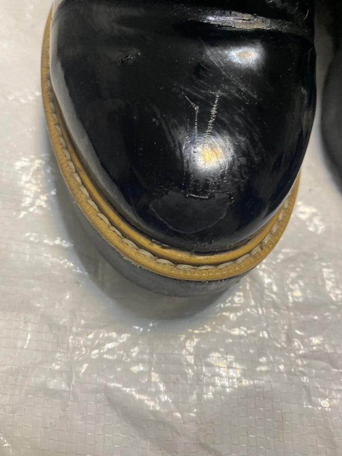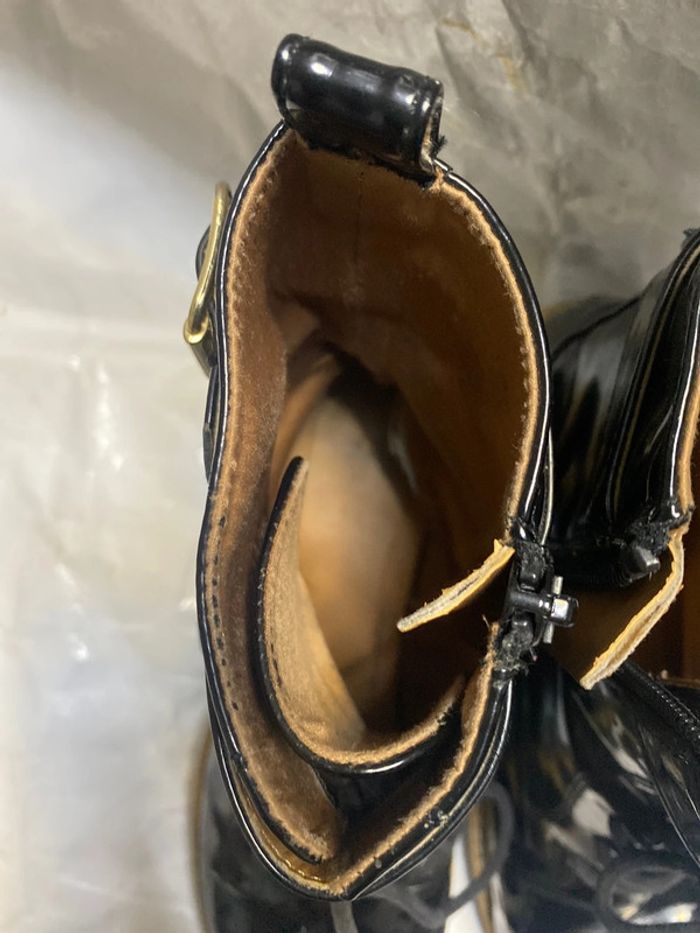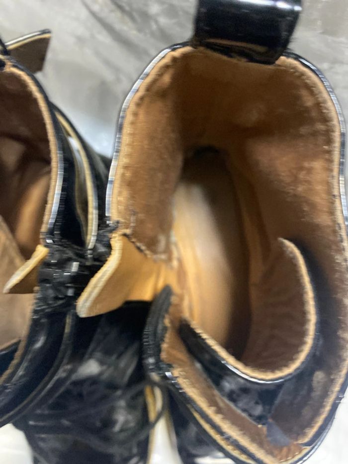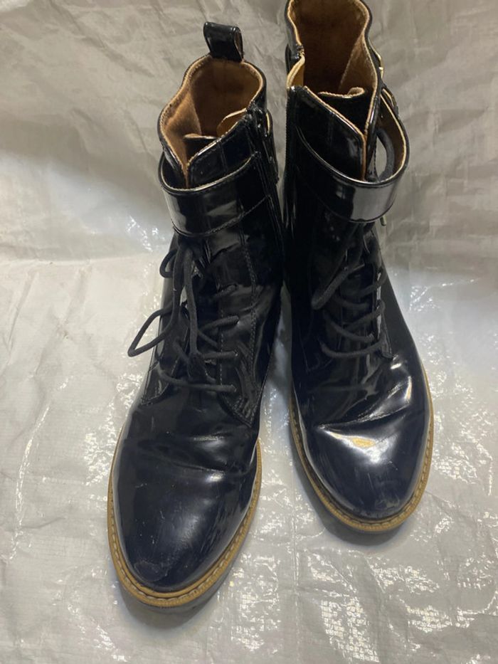 Bottines en très bon état. Vernis. Fermeture zip. Longueur totale 18,5 cm . Hauteur talon 3,5 cm . Légères imperfections voir photos .