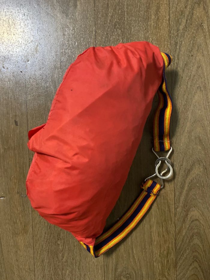 Reste légère, imperméable avec capuche vintage. Réversible en sac, banane.. une poche . longueur, 64 cm.un petit accroc dans la poche intérieure sur la couture discret .