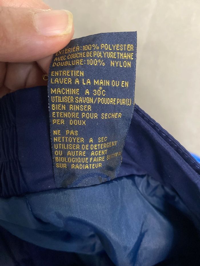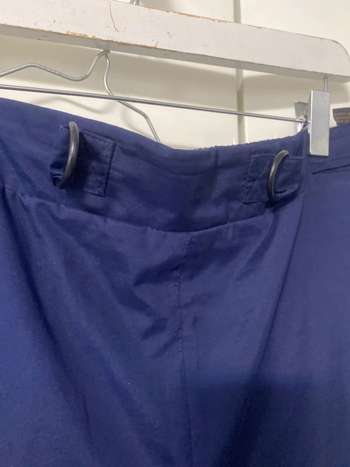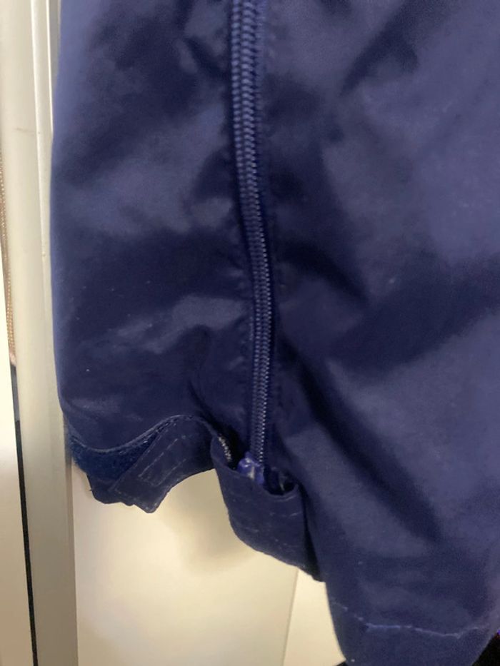 Pantalon extérieur imperméable. Taille, élastique ajustable avec scratchs. Bas avec fermeture zip et scratch. Deux poches. Une poche arrière avec scratch. Longueur 102 cm .