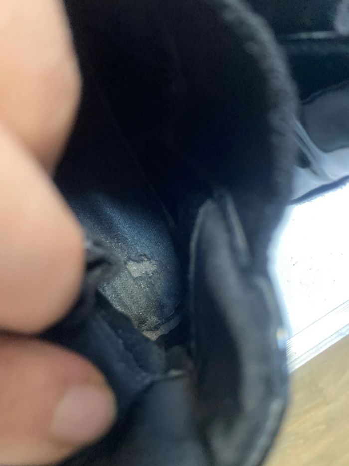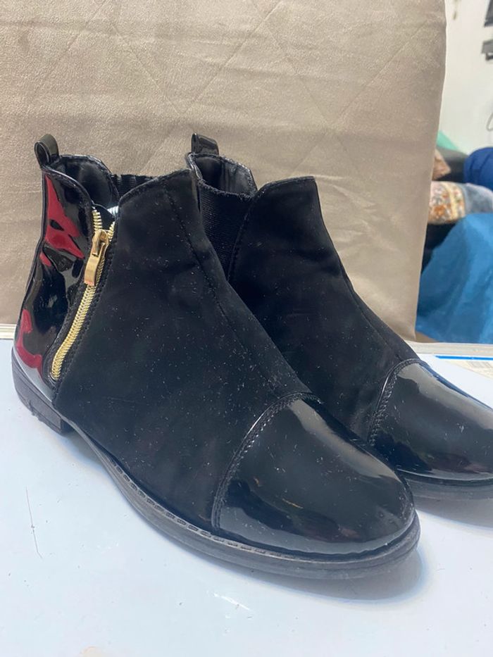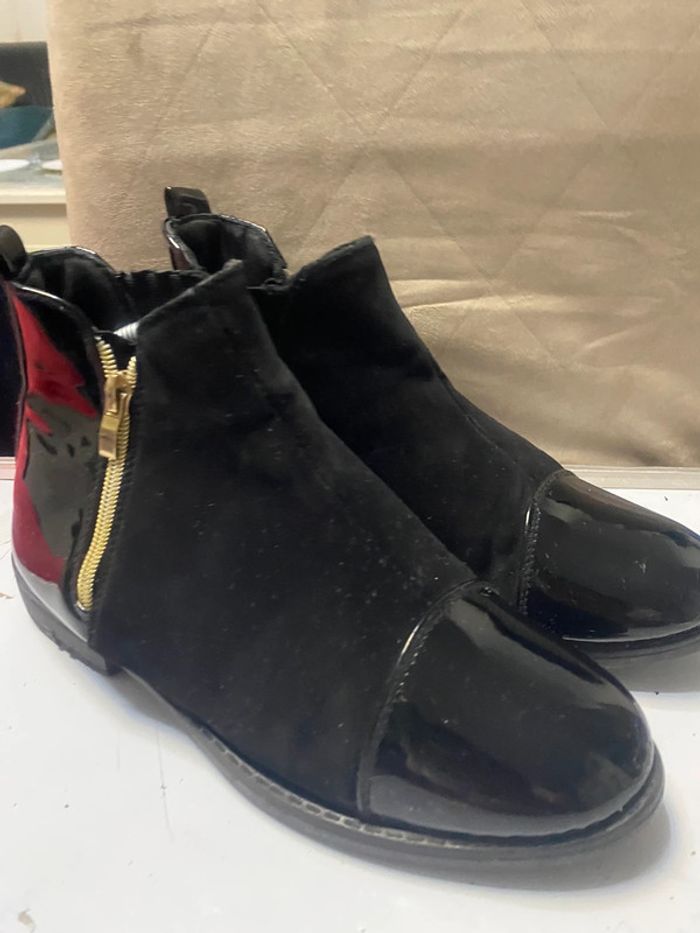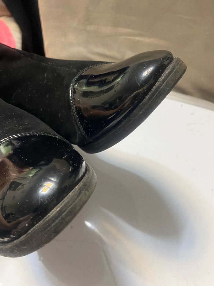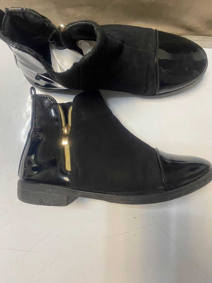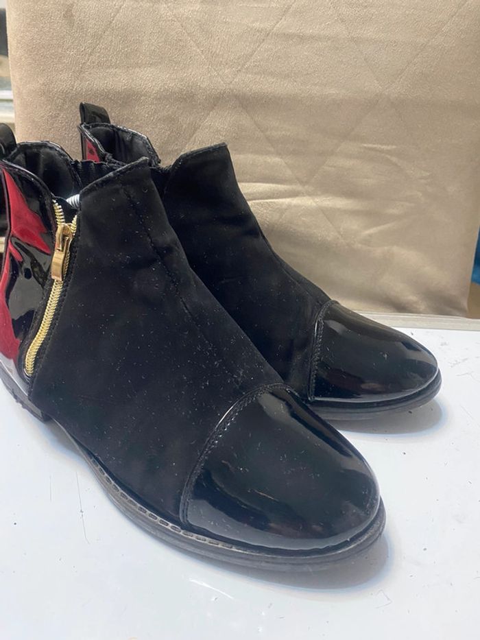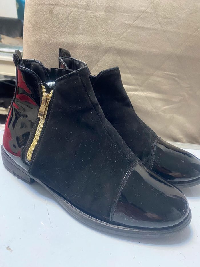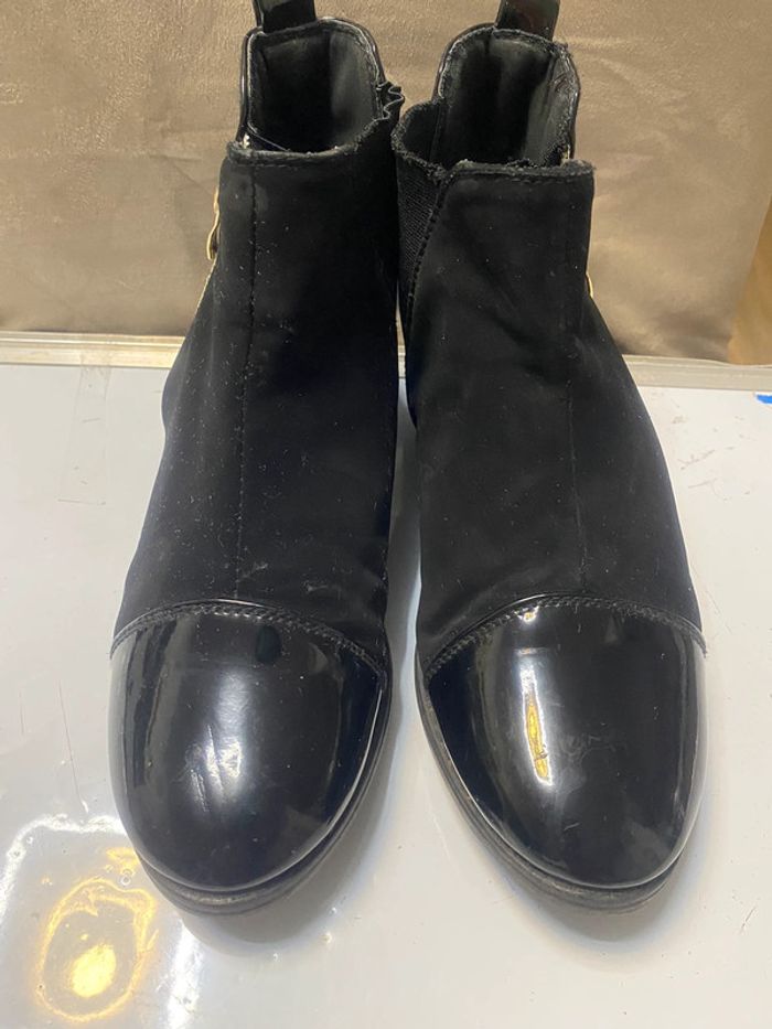 Bottines fermeture zip double effet daim et brillant. Ajustable élastique . Une légère imperfection à l’intérieure accroc du tissu de 1 cm discret et non genant ( voir dernière photo . ) . Hauteur talon 2,5 cm