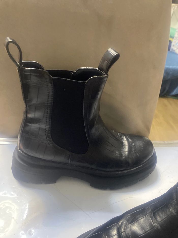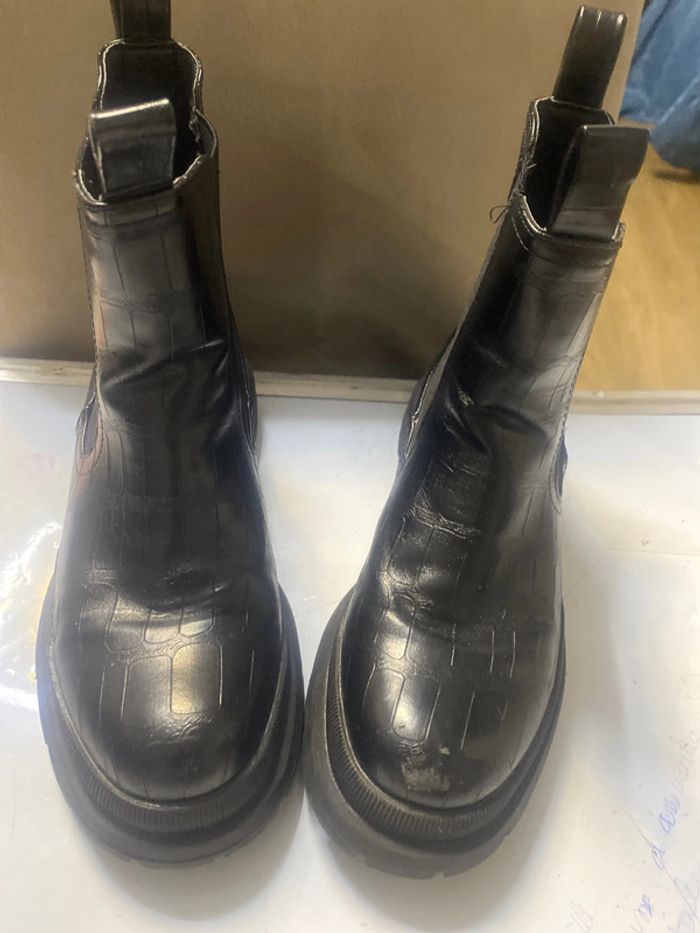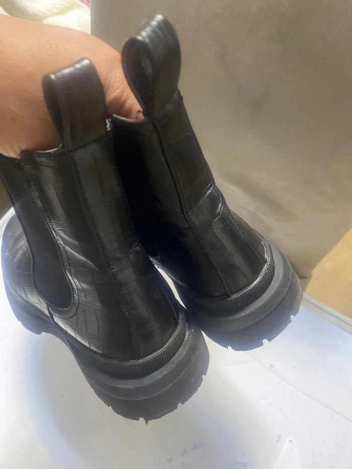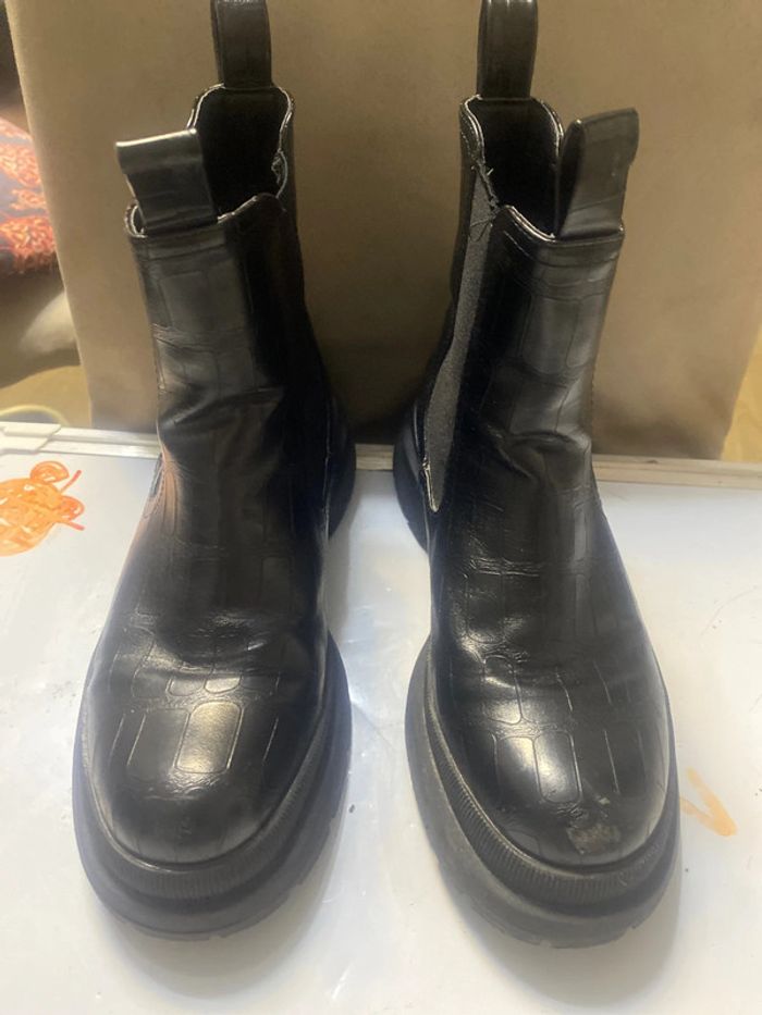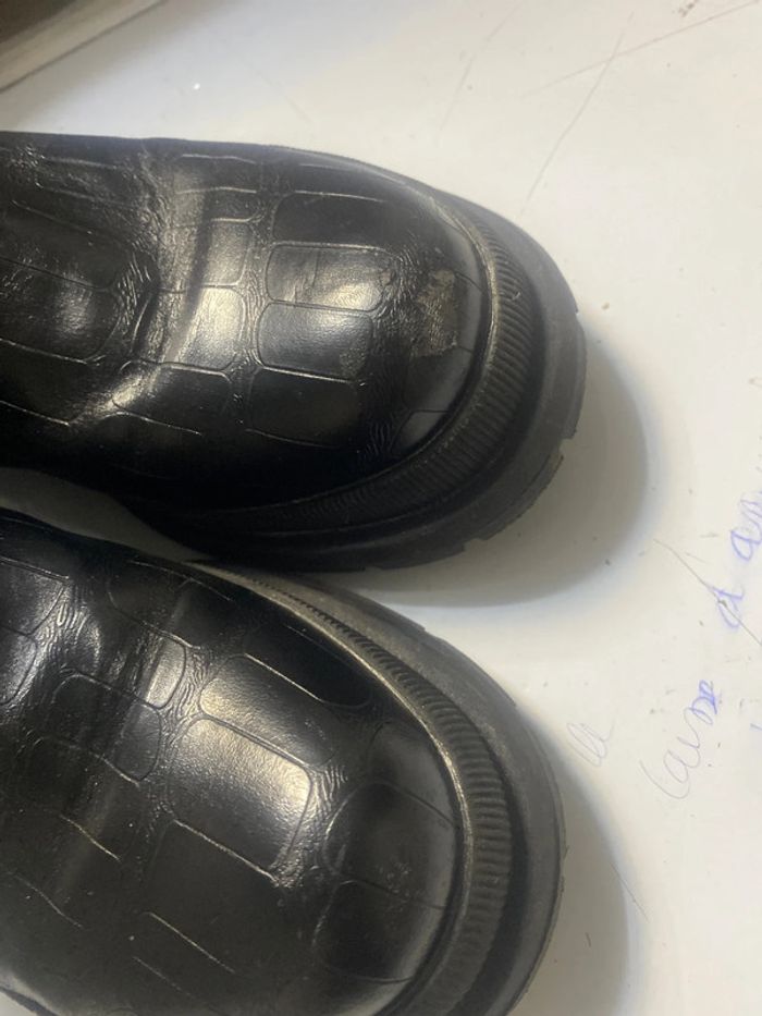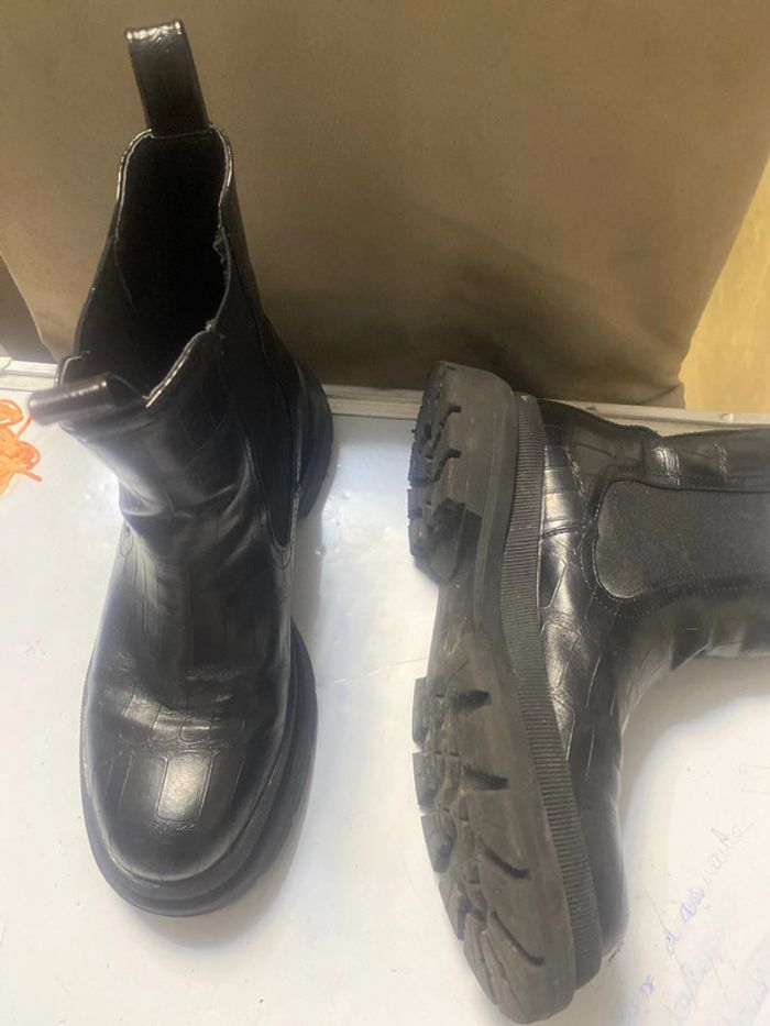 Bottines. Légères imperfections à l’avant de la chaussure petite croûte de 1 cm voir photo ( pouvant se cacher par feutre noir indélébile ) le reste est en très bon état. Talon 3 cm. Ajustable extensible .