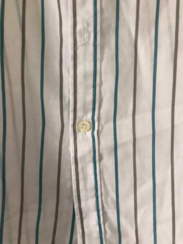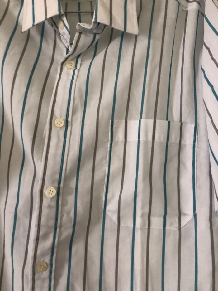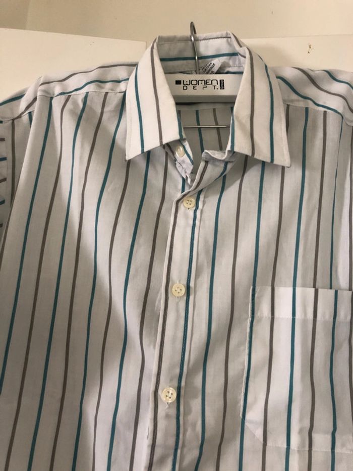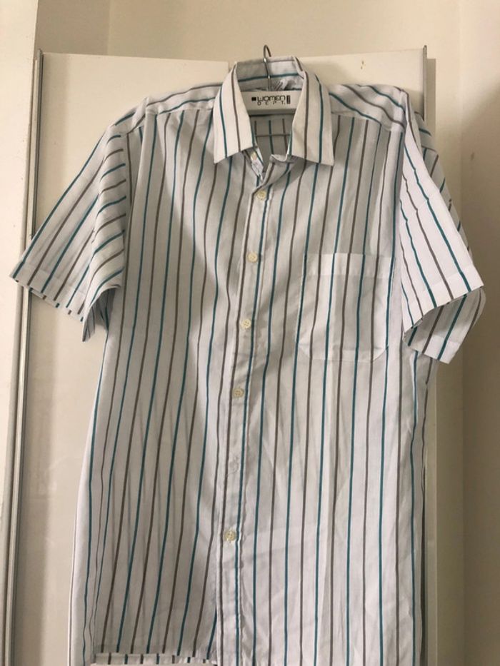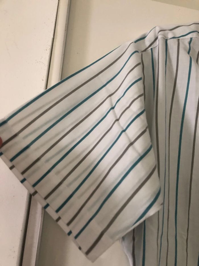 Parfait état . Légère .1 poche Longueur 73 cm . Rayures gris et turquoise. Épaule à épaule 44 cm . Aisselle à aisselle 56 cm. Existe Même modèle en rayures bleu foncé et gris sur ke dressing