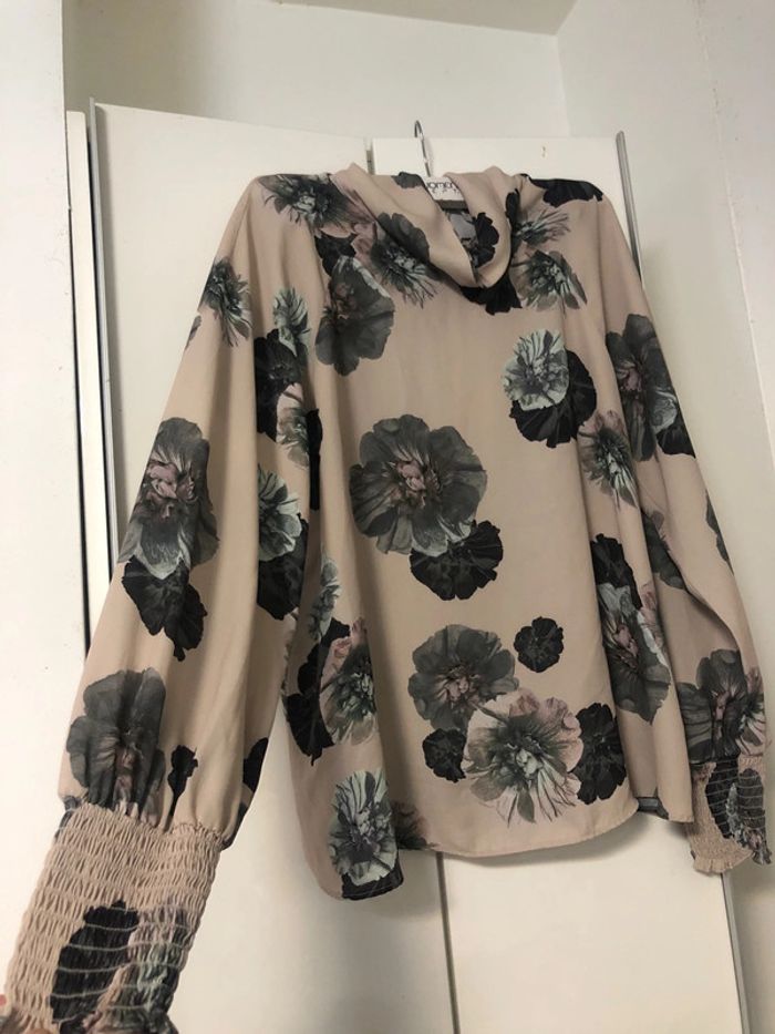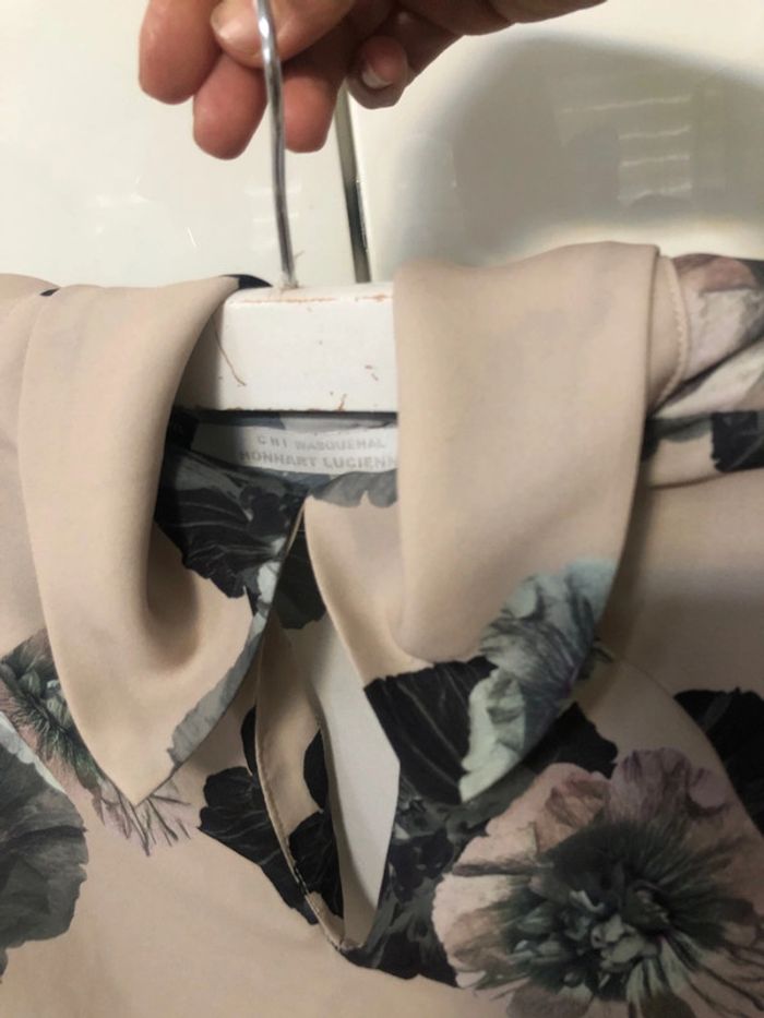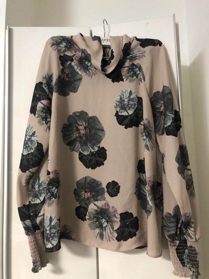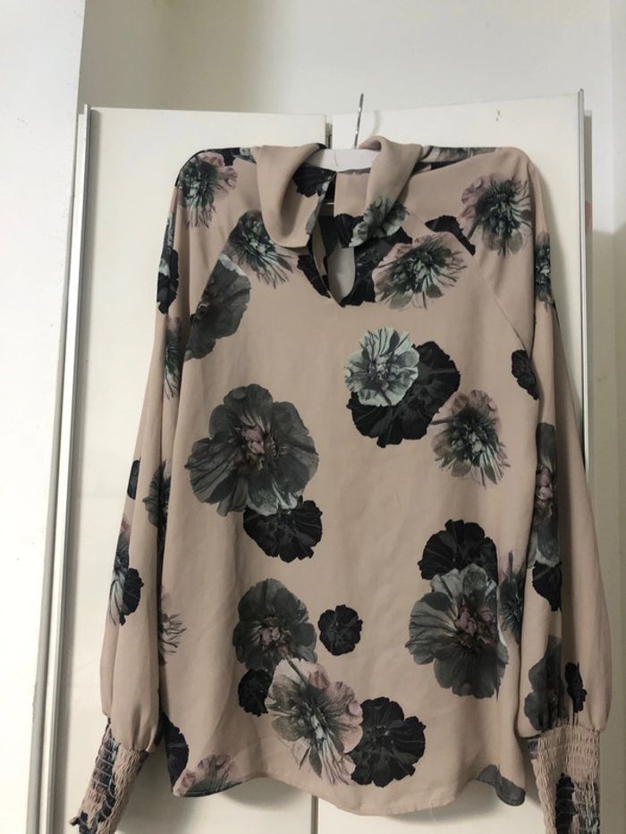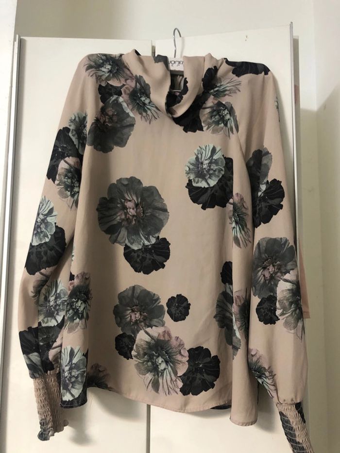 Très bon état . Très Léger . Fluide . Manches longues . Peut se porter des 2 faces pour col changeant avant col montant ou arrière col chemise voir photos longueur . Dimensions épaule s épaule aisselle à aisselle 59 cm
