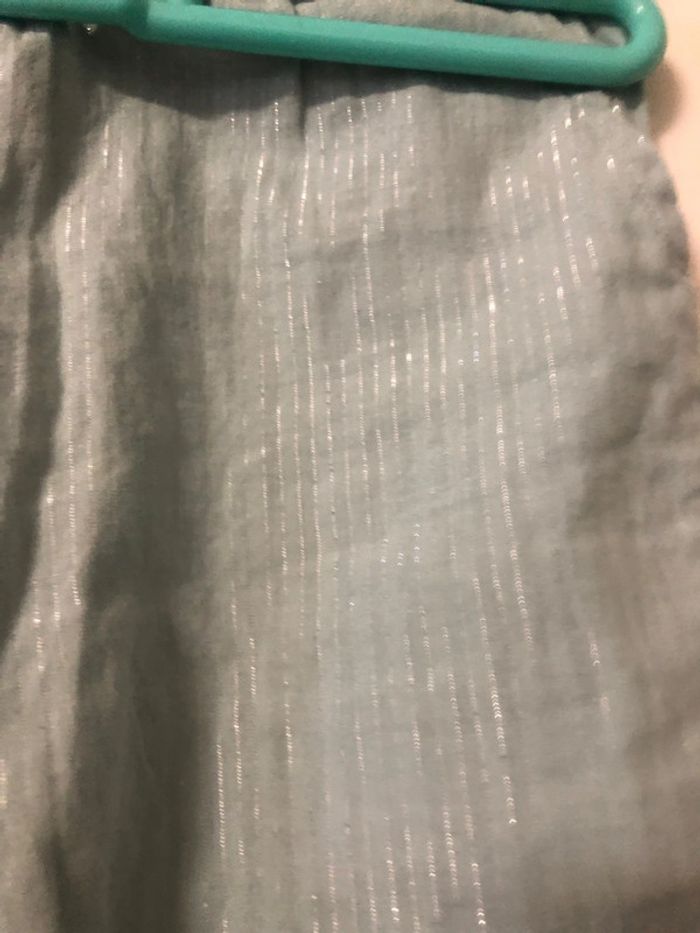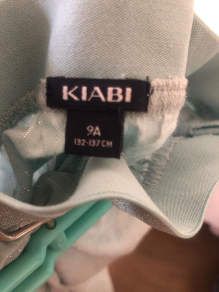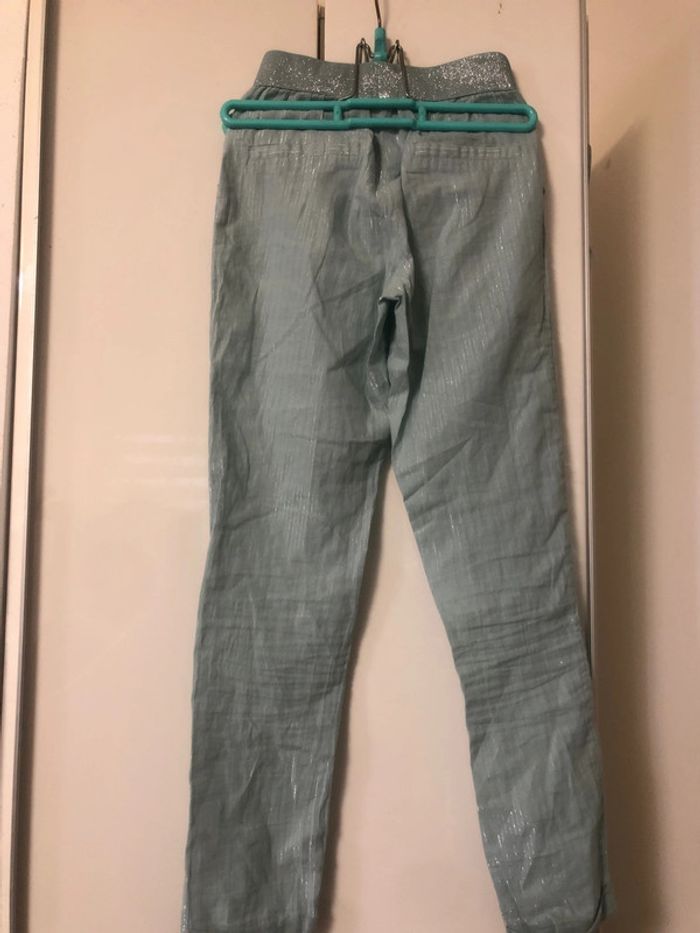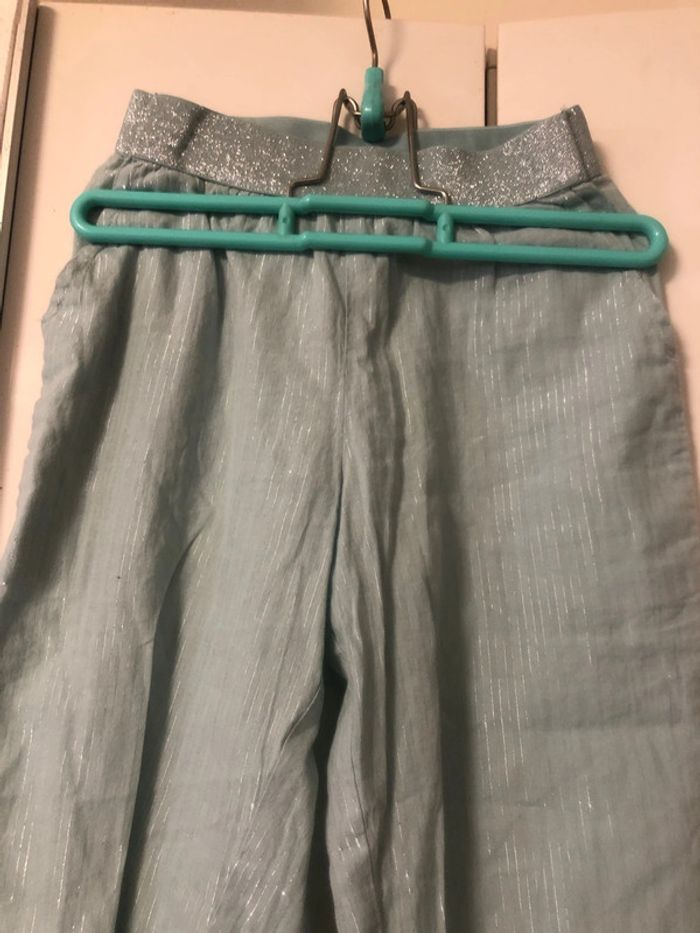 Parfait état .état Léger .. Paillettes . Taille avec Ceinture large élastique ajustable . Plus bas de pantalon . Poches avant et arrière . 133/137 cm . Vert clair / turquoise .