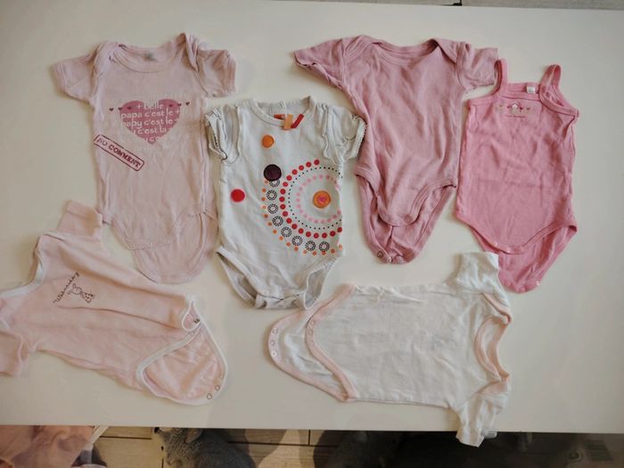 Lot de 6 body manches courtes taille 3 mois, sur un des body les écritures ont des petites craquelures Regardez mes autres ventes plusieurs vêtements de taille différentes à vendre. Remise sur lot activée