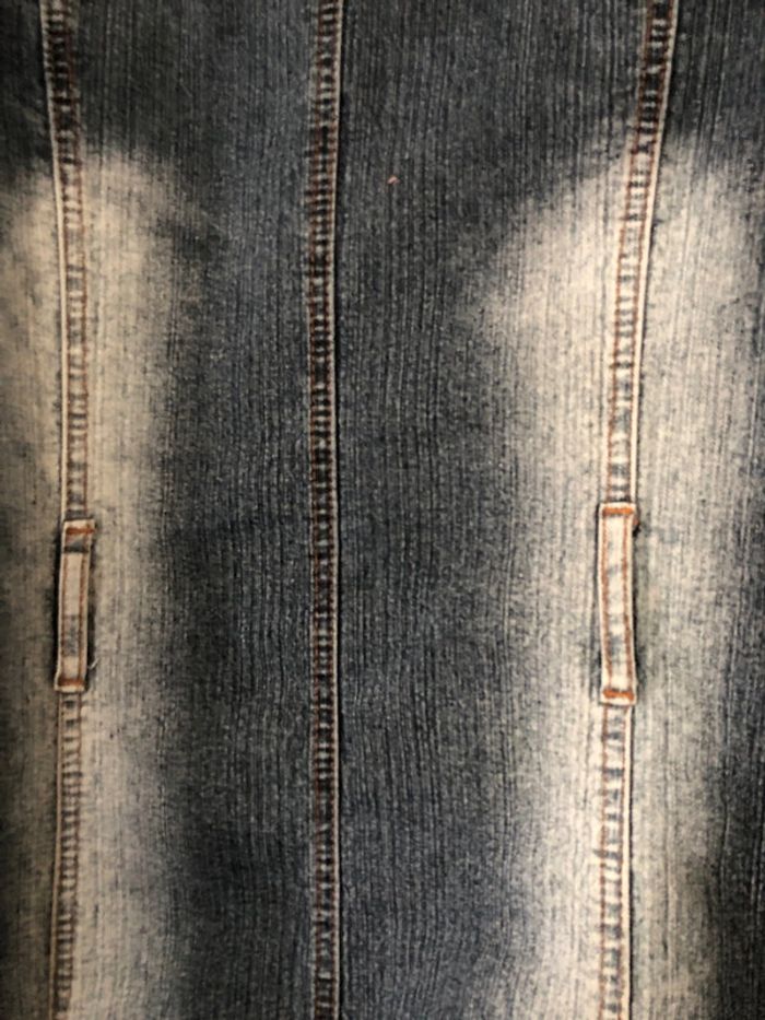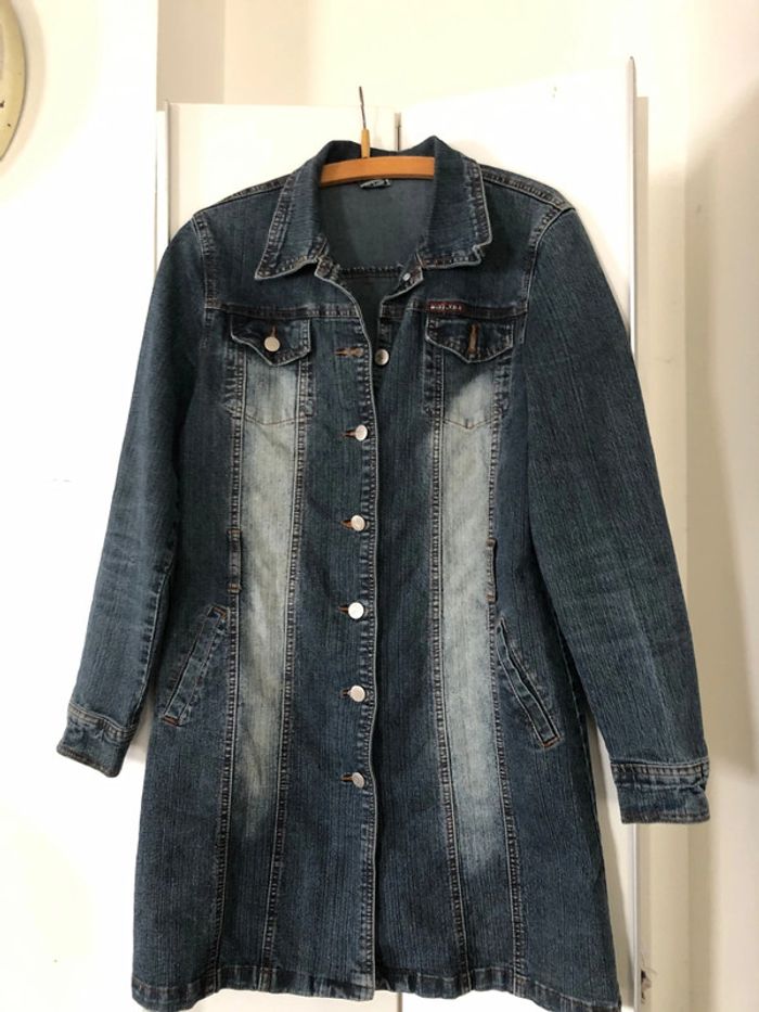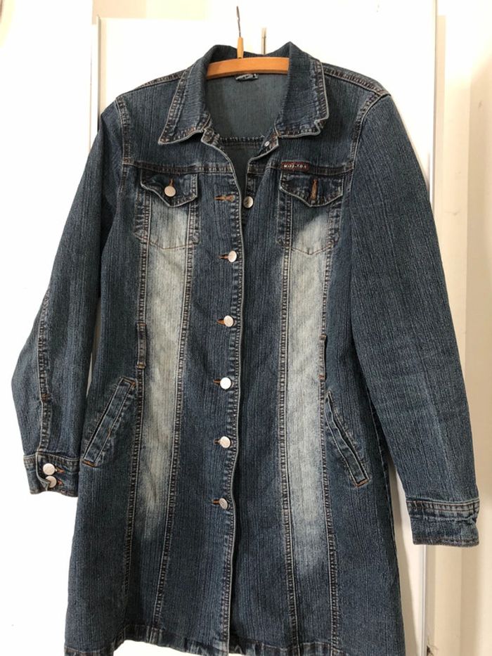 Longue veste jean délavée Parfait état . Longueur 87 cm . Poches avant et cotes .