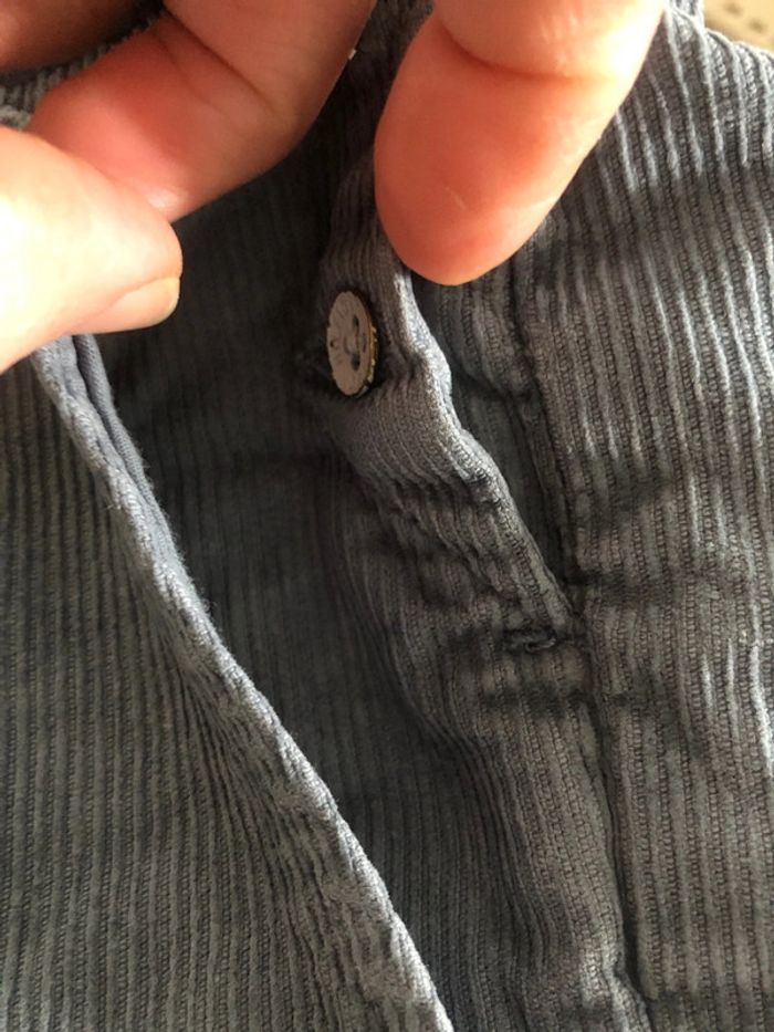 Parfait état . Matière jean rayé .2 poches avant et 2 poches arrière dont une double poche .longueur 100 cm