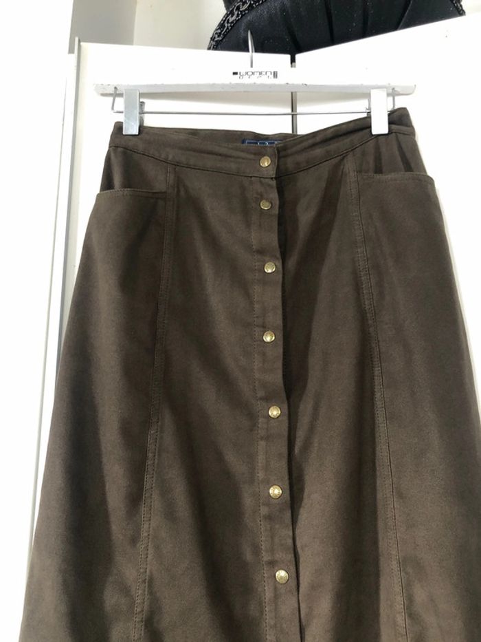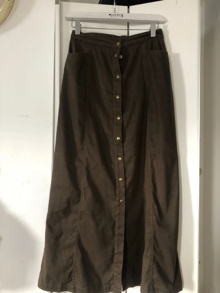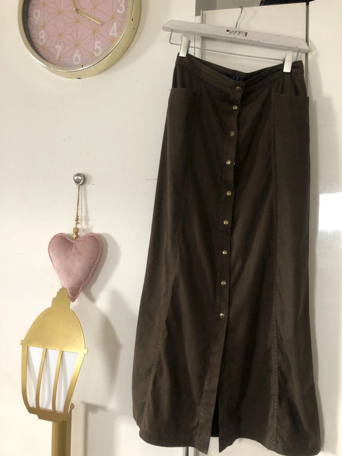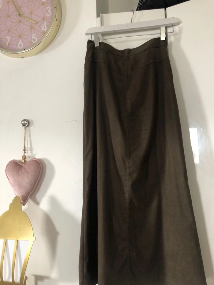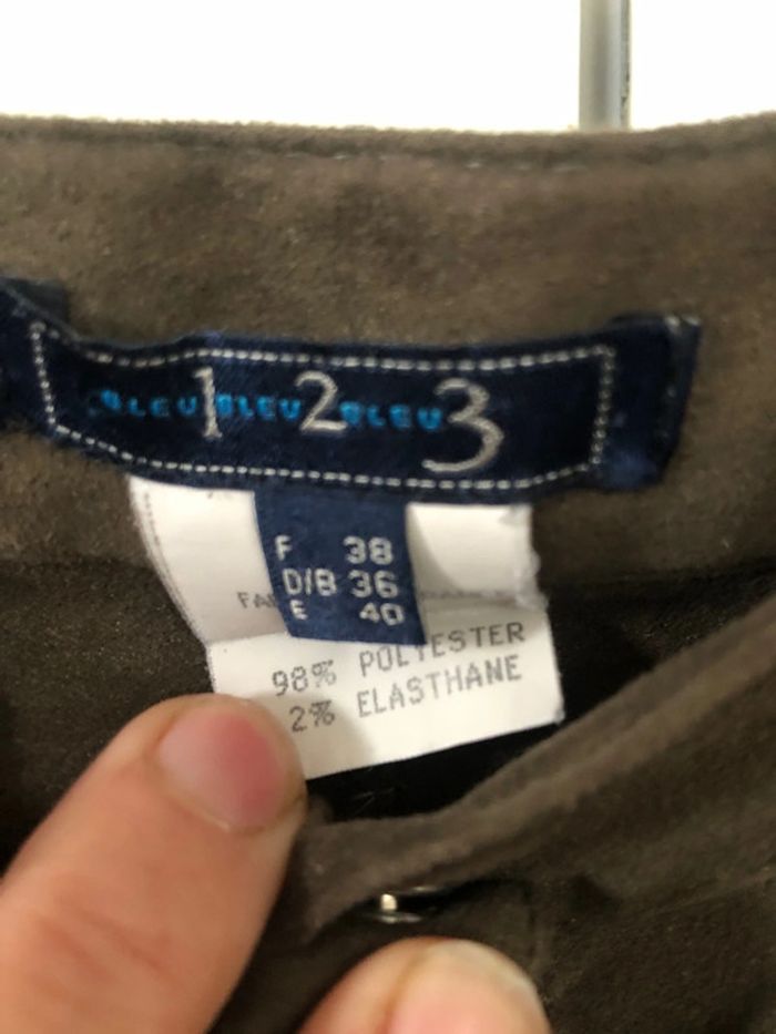 Tres Bon etat . Boutons à pression . 88 cm de longueur . 2 poches . Matière daim . Taille 34 cm . Note 38 mais taille plus petit