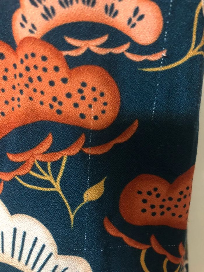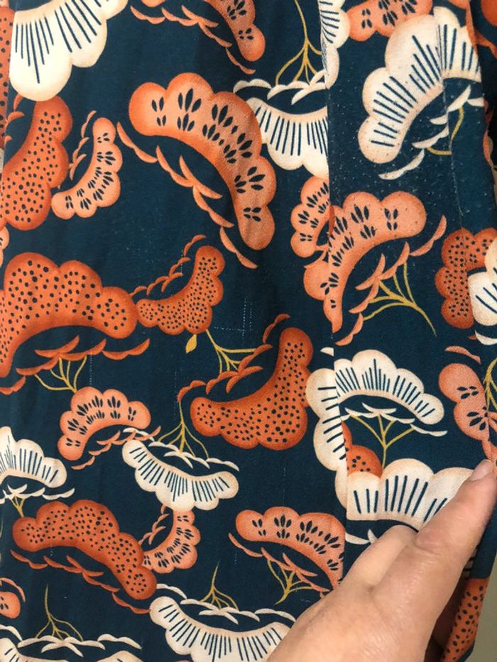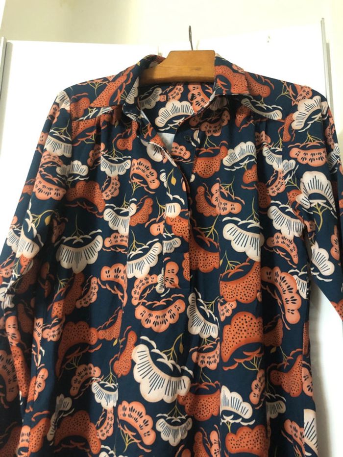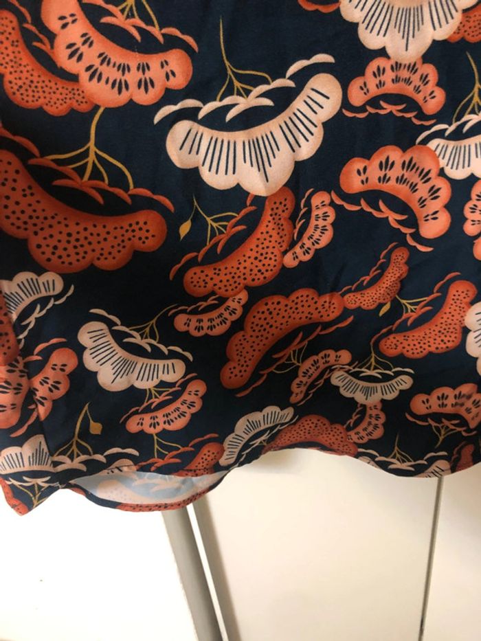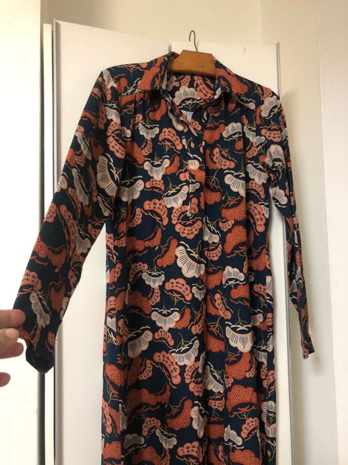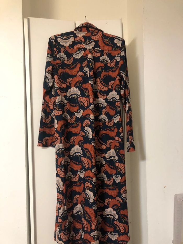 Matière fluide . Manches longues . Longueur 120 cm .forme arrondie en bas de robe . Discrètes imperfections dernières photos . Épaule à épaule 38 . Aisselle à aisselle 48cm .