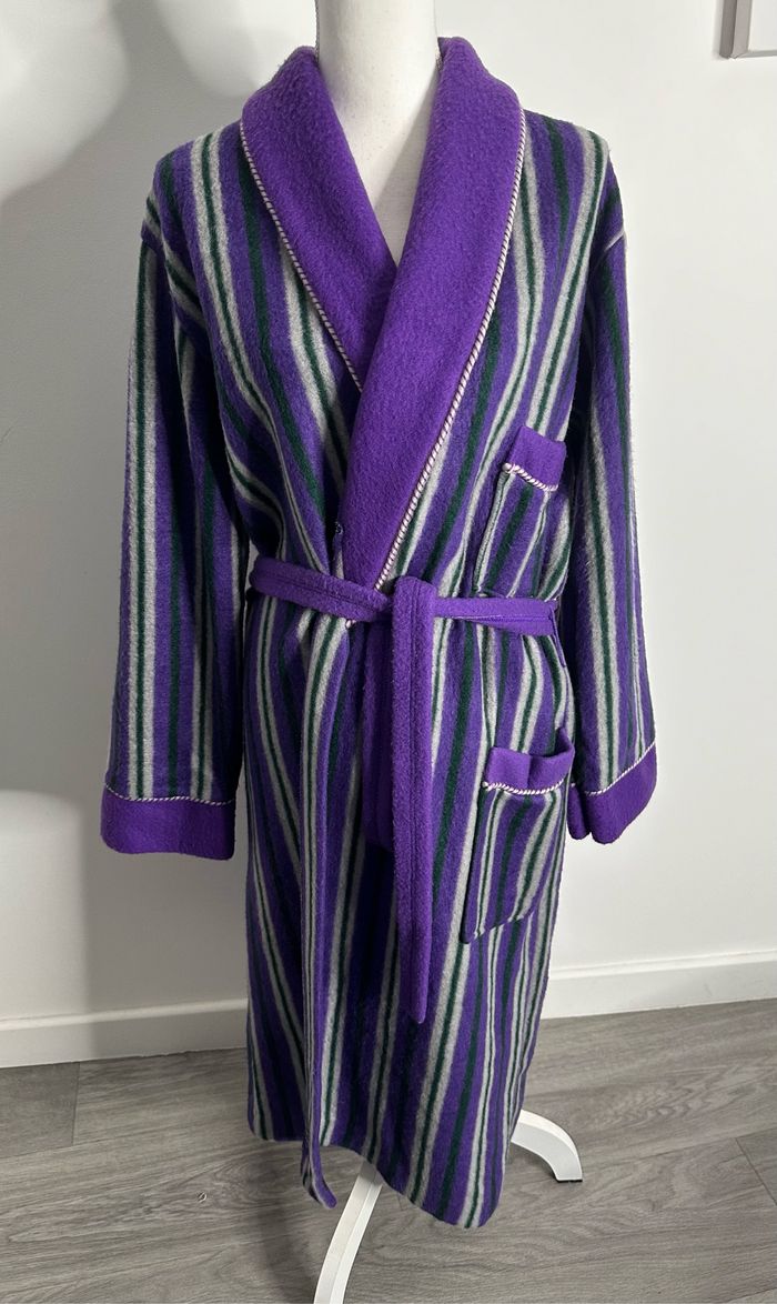 Peignoir long - Excellent état - Taille unique, ok du 36 au 48 Dimensions en bas de l’annonce - Modèle unisexe - Vintage, années 80-90’ - Violet vert foncé et gris - Ceinture à la taille - Deux poches à l’avant - Polaire - Tissus à rayures, rayé - Ultra doux et chaud - Acrylique et polyester Dimensions: - 65cm niveau aisselles - 114cm de long