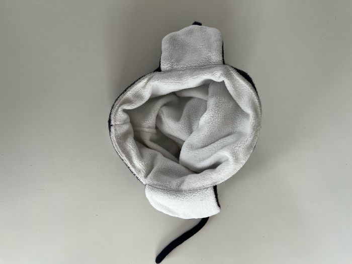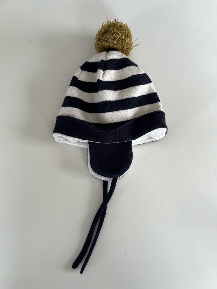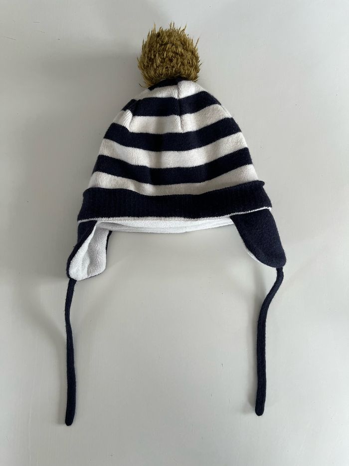 Bonnet rayé marine et blanc avec pompons et cache oreille. Doublure 100% polyester. Pour enfant entre 2 et 3 ans