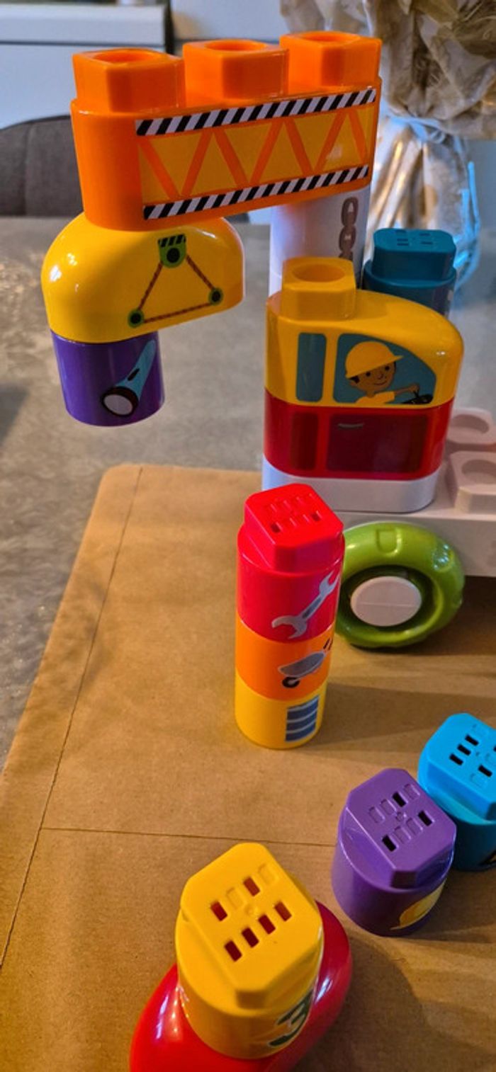 En très bon état, manque un seul bloc, le blanc avec le mètre, à été manipulé quelques fois Système de construction avec des blocs interactifs adaptés aux tout-petits 30 blocs illustrés et colorés à connecter pour de super créations sur le thème du chantier Des blocs intelligents à connecter pour les petits de 18 mois à 5 ans La base électronique parlante reconnaît les blocs interactifs et réagit Apprentissage des couleurs, chiffres et le nom des outils. Vends également d autres bla bla blocks #amvanessajouetbebe #amvanessajouetenfant