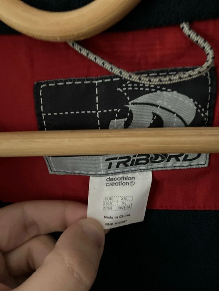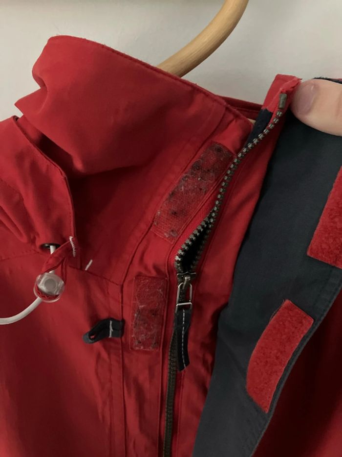 Bon état, il n’y a aucun trou dans la veste, juste des poils d’animaux accrochés aux scratchs. La tirette/ fermeture éclaire est assez sensible. C’est une veste en moumoute/polaire avec capuche Tribord de chez décathlon. XXL