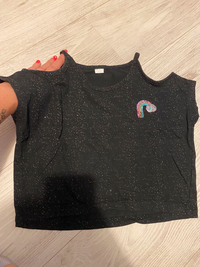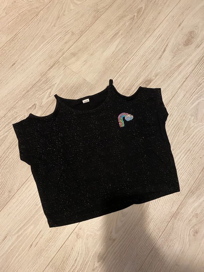 Joli top noir pailleté épaules dénudées motif arc en ciel Matiere agréable Porté mais sans trou ni tache #topfille7ans #topfillenoir