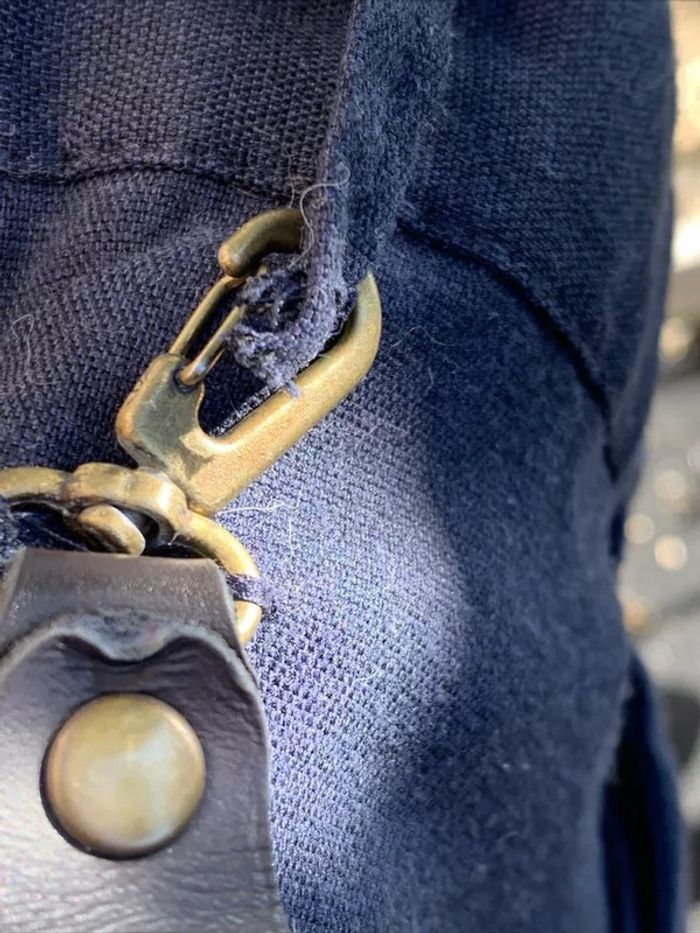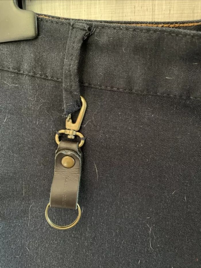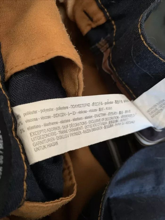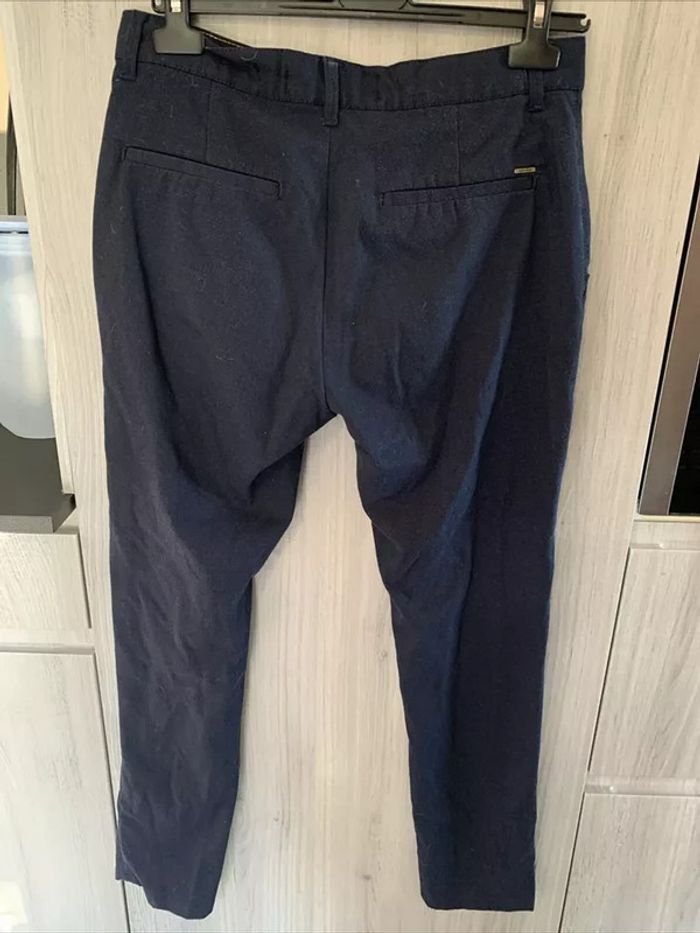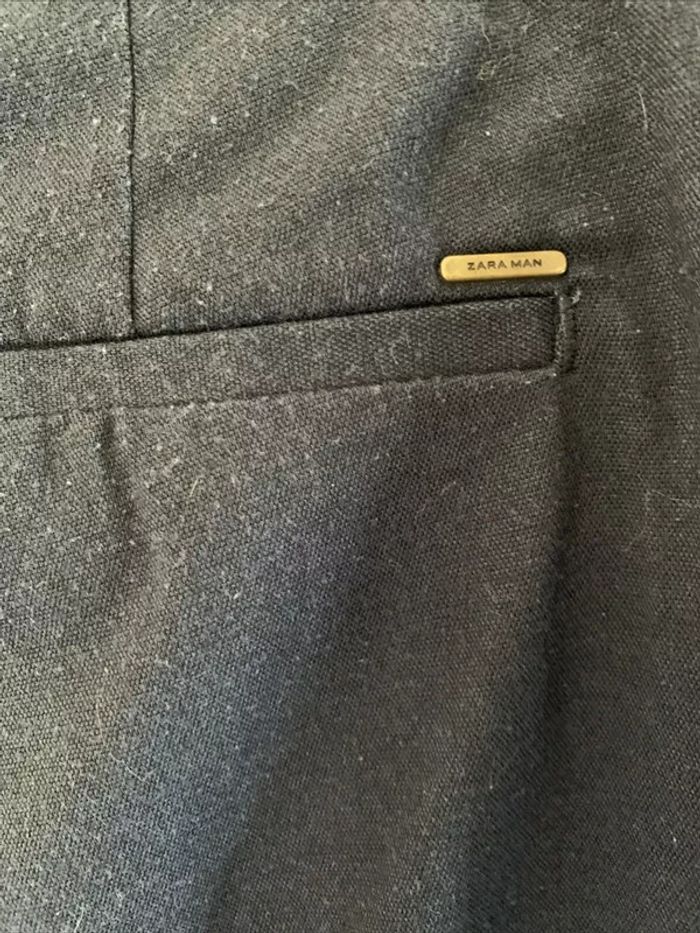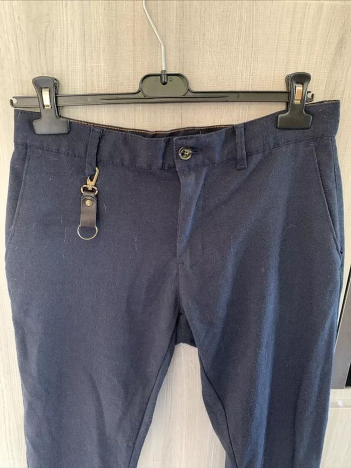 Pantalon Habillé Bleu Marine avec breloque décorative Zara Man Taille 38 Matière légèrement peluchée, le passe ceinture où il y a la breloque est un peu décousue Longueur entrejambe jusqu'en bas : 70 cm