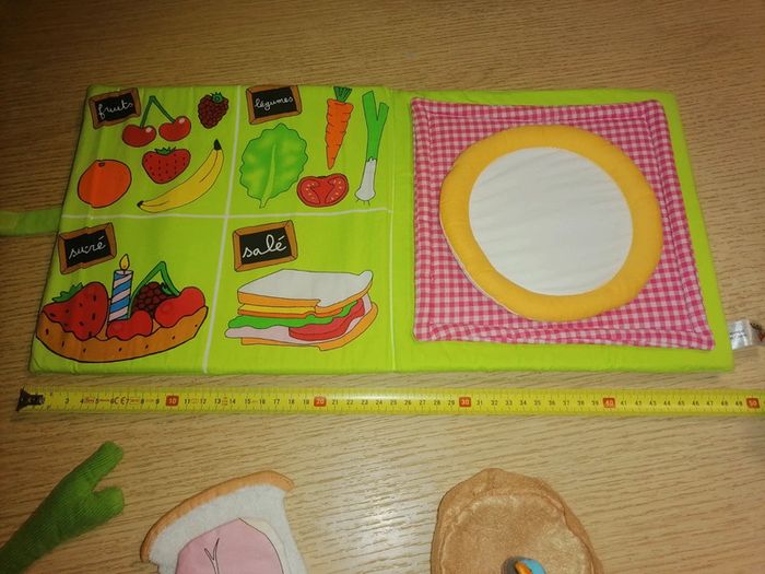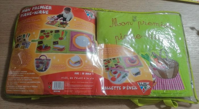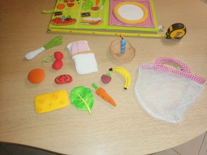 Socle en tissu avec panier de provision et éléments du pique-nique en tissu. Très bon état. Prix en lot uniquement.