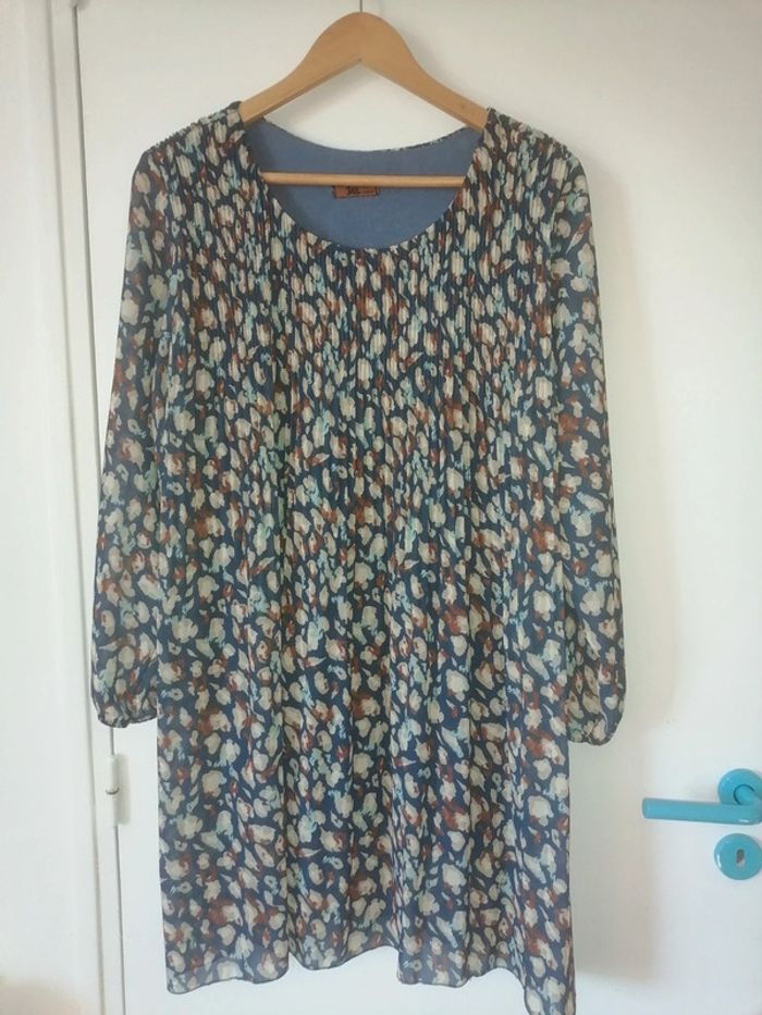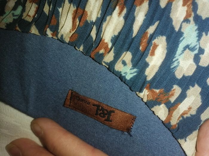 Tunique marron et bleu haut élastiqué. Dimension aisselle à aisselle 65cm, carrure 48cm et hauteur 82cm.
