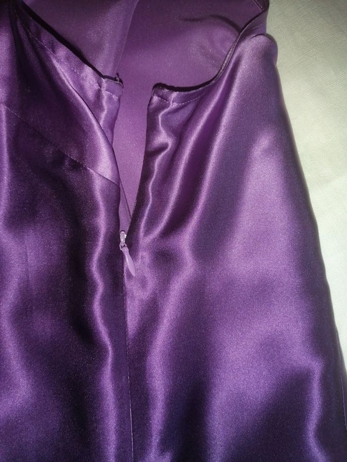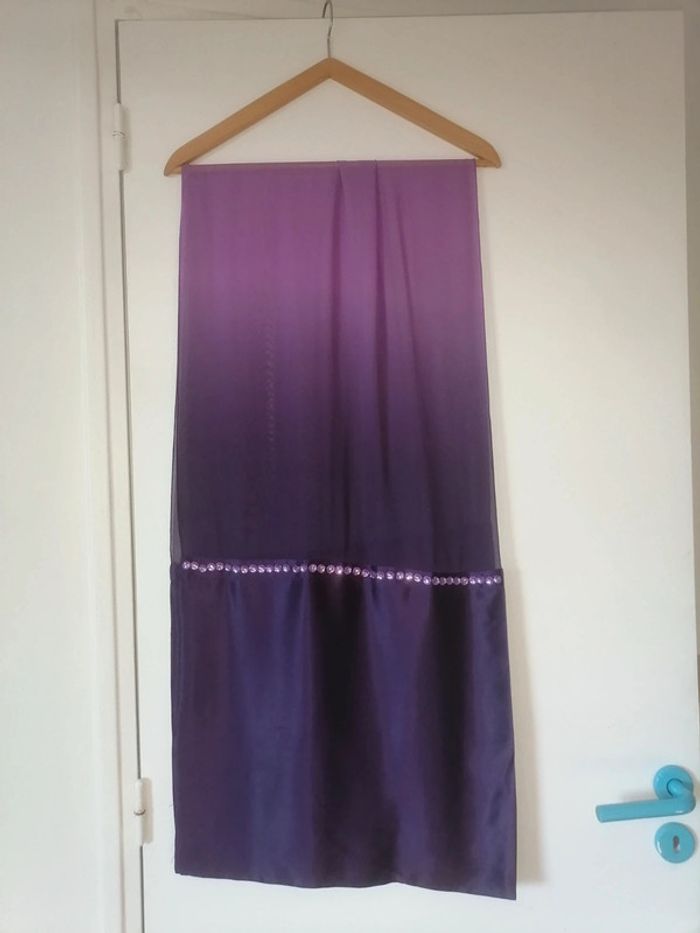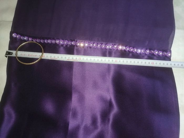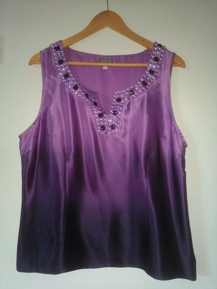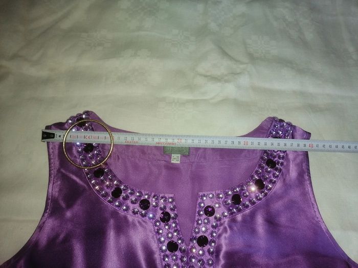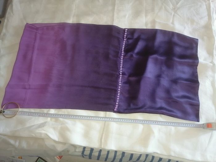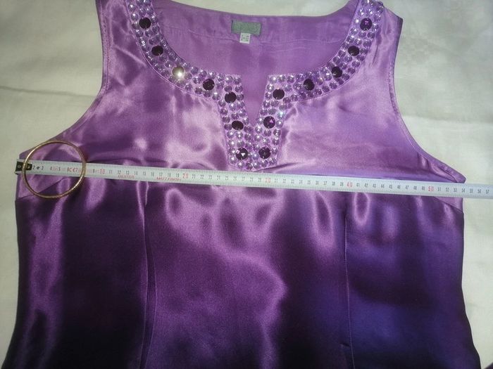Débardeur habillé en satin violet/aubergine avec perles et étole voile et satin avec perles. Porté une fois pour un mariage. En excellent état. Étiquette 46 mais taille 44 Dimensions aisselle a aisselle 54cm encolure 40cm et hauteur 62cm. Étole 45cm x 180. Vous trouverez le bas dans le dressing de roalou "pantalon de fête" aubergine.