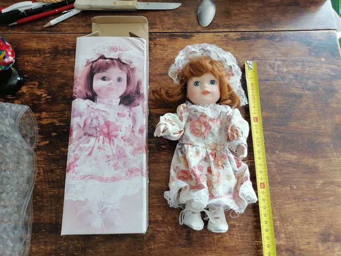 Jolie poupée neuve, visage en céramique tes robuste et corps tissus. Belle facture de 25 cm. Avec son emballage.