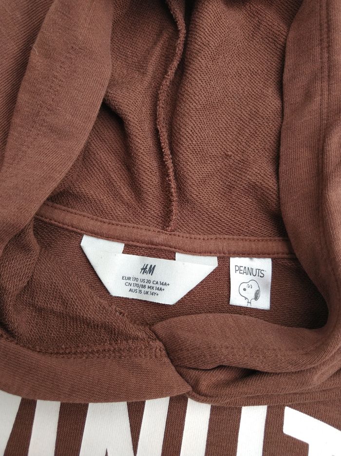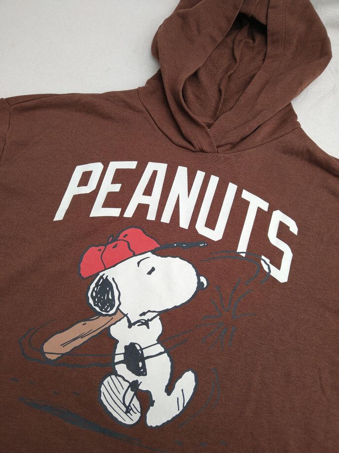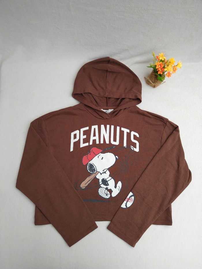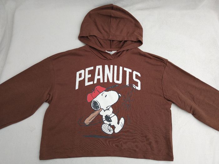 Pull à capuche court et à manches longues Marque H&M Taille 14 ans +, 170 cm • Coloris marron, blanc • Inscription "Peanuts", Snoopy • Balle de base-ball sur une manche • Oversize En très bon état #evelyne_filles_14ans #evelyne_filles