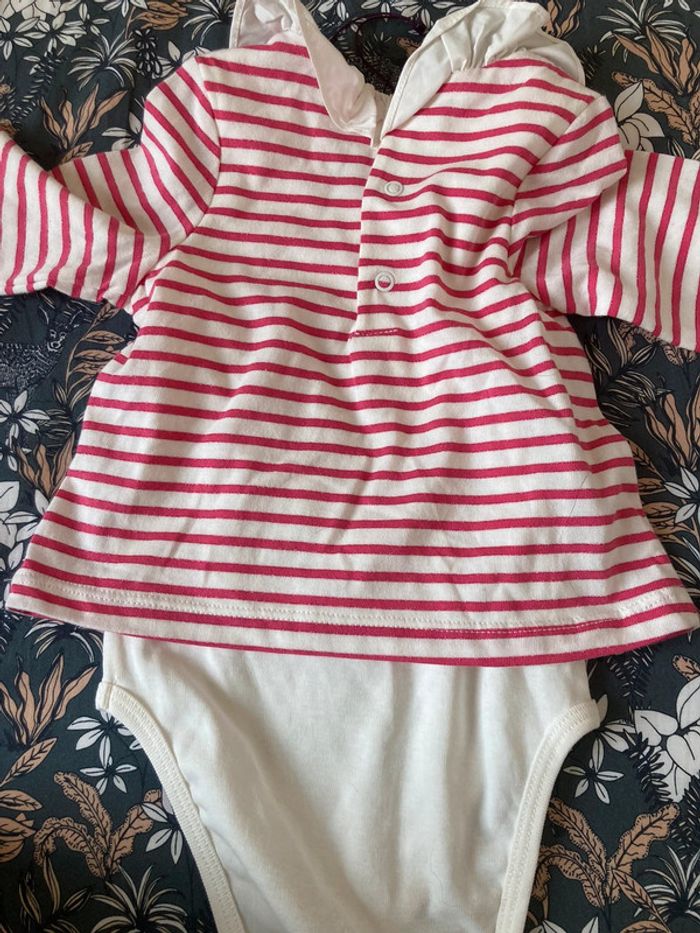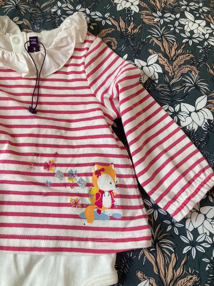 Body t-shirt tout en un Neuf jamais porté avec étiquette Légère trace qui a du se faire dans le placard au niveau fermeture du body qui partira au lavage Taille 6 m’ois